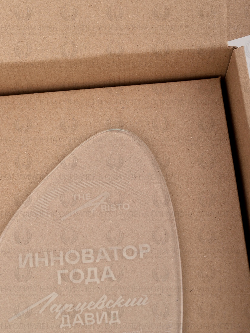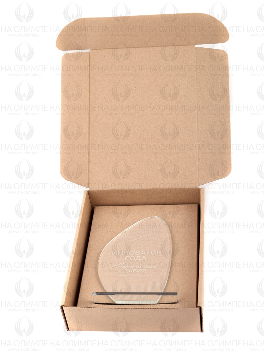 Стеклянная награда с гравировкой. Толщина стекла 6 мм. Стоимость указана за нанесение на одной стороне. Поставляется в крафтовой коробке.