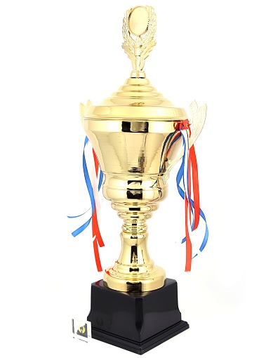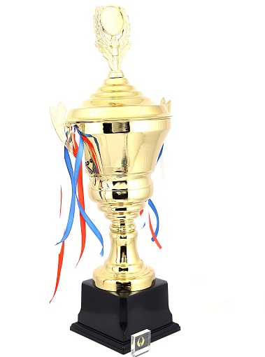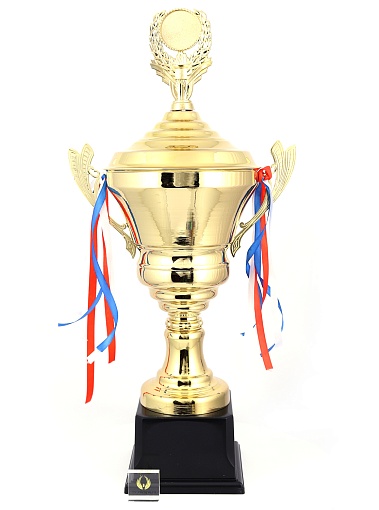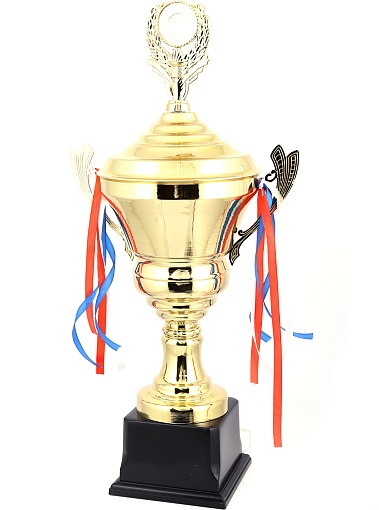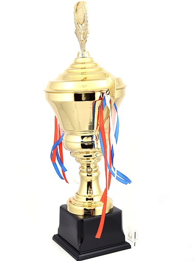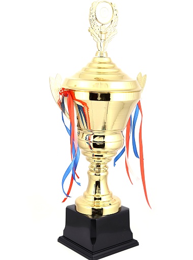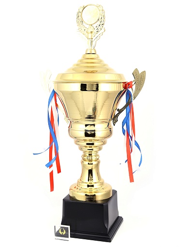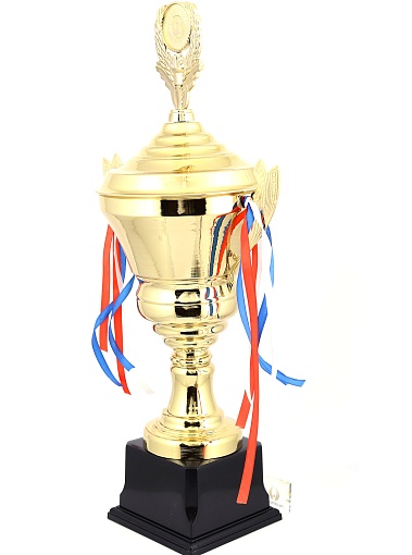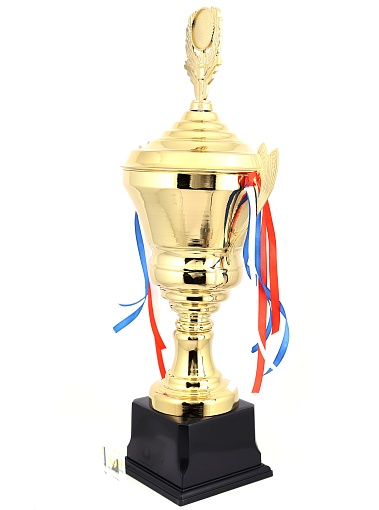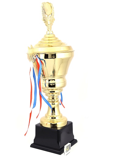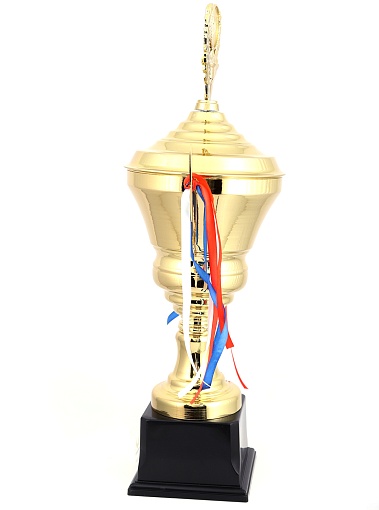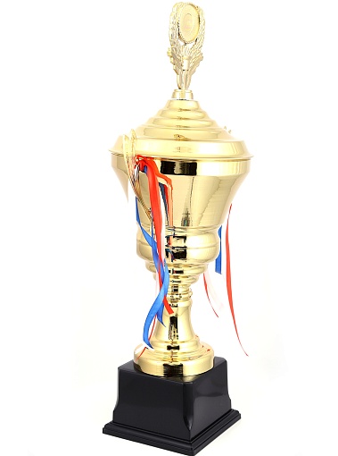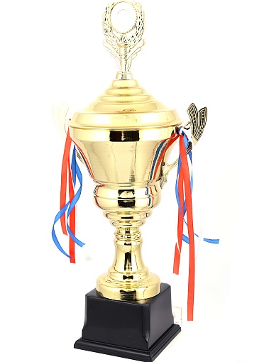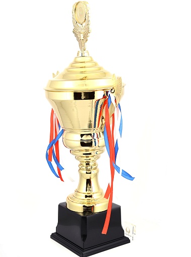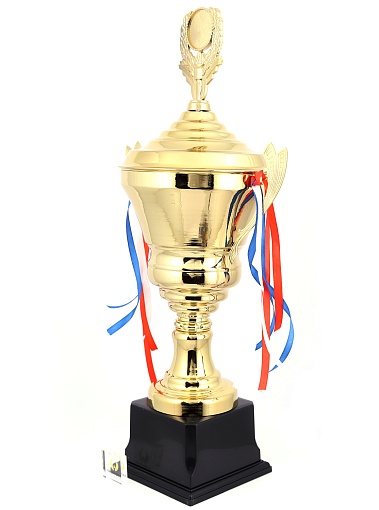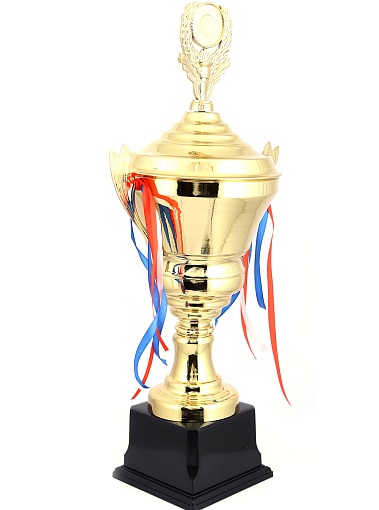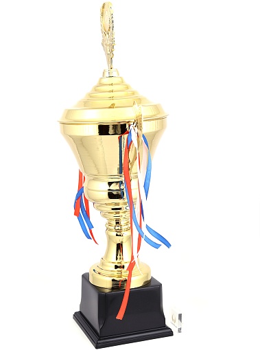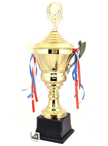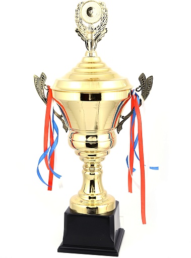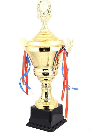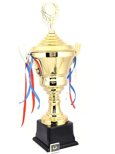 Кубок с металлической чашей, ножкой и крышкой на пластиковом постаменте. Ленточки из полиэстера украшают ручки кубка, но при необходимости их легко можно снять.