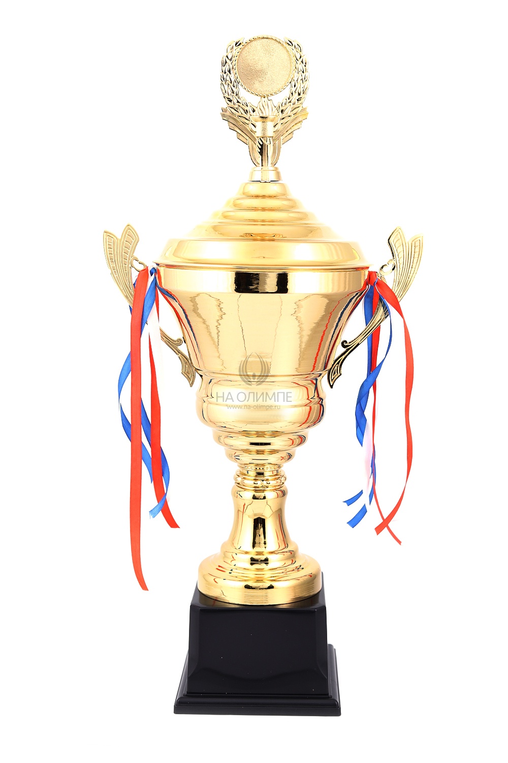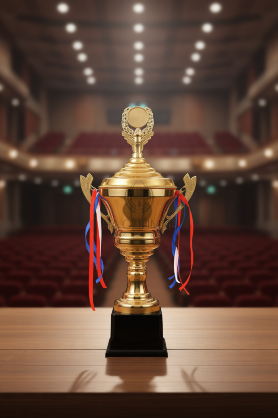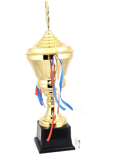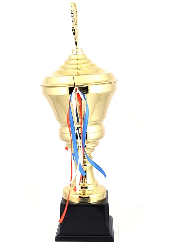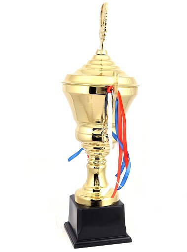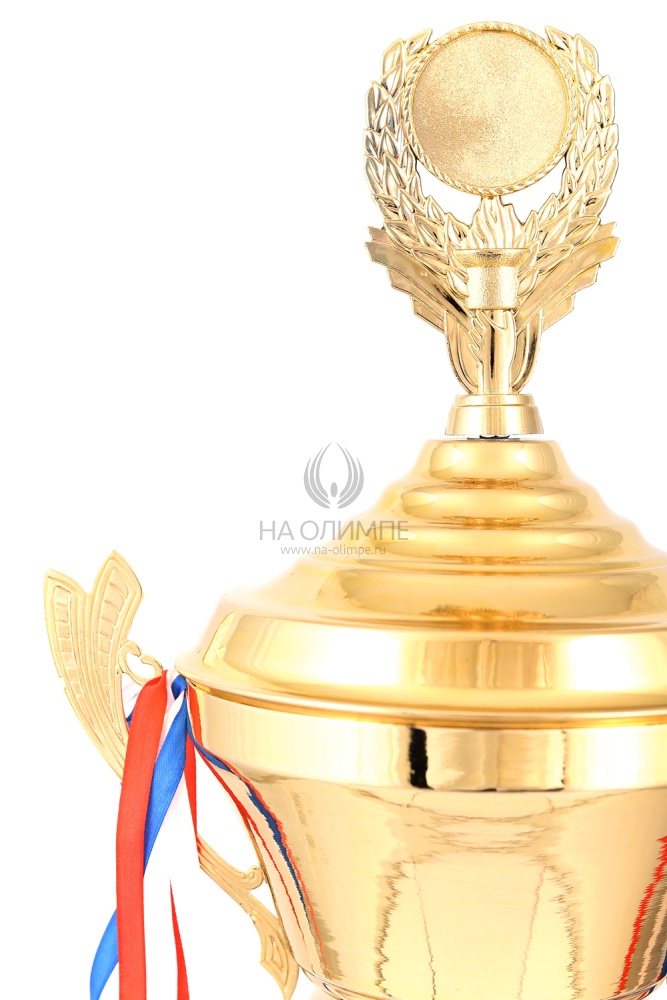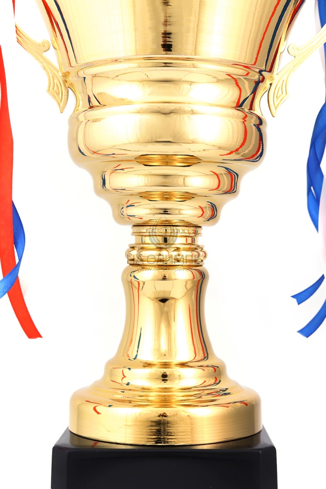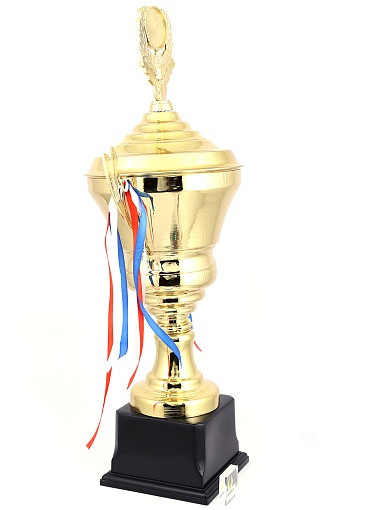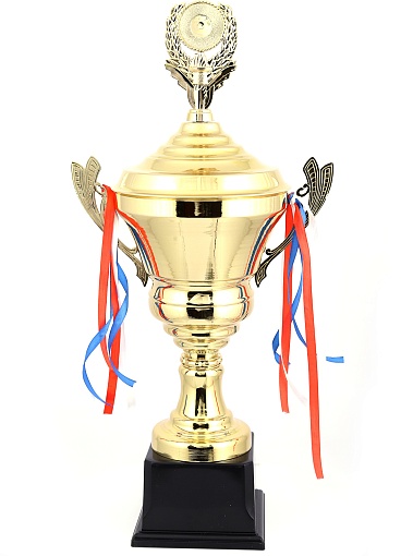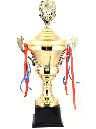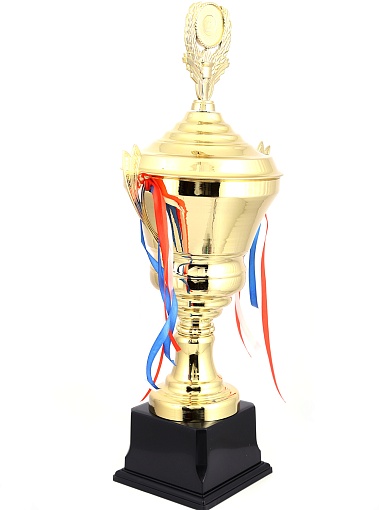 Кубок с металлической чашей, ножкой и крышкой на пластиковом постаменте. Ленточки из полиэстера украшают ручки кубка, но при необходимости их легко можно снять.