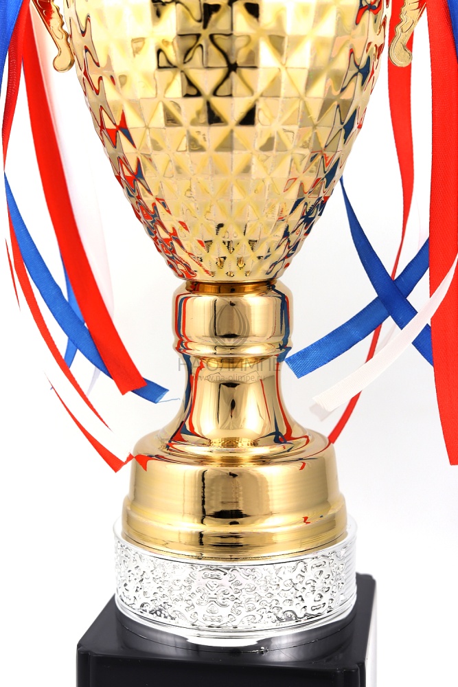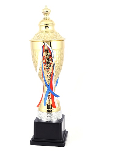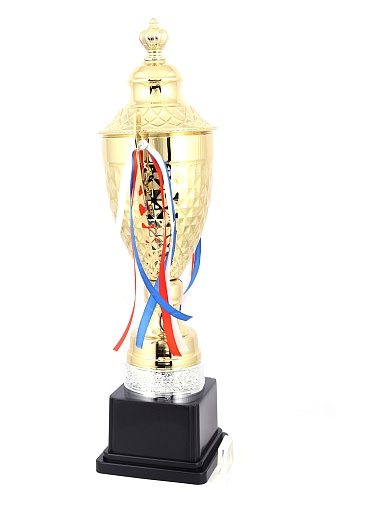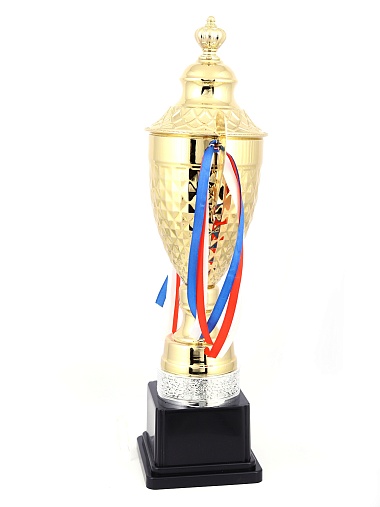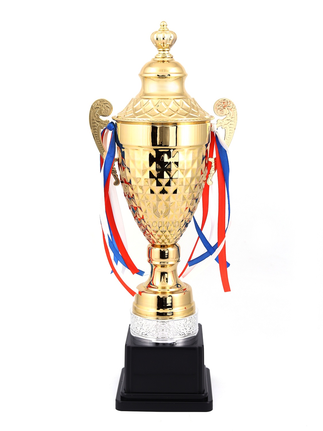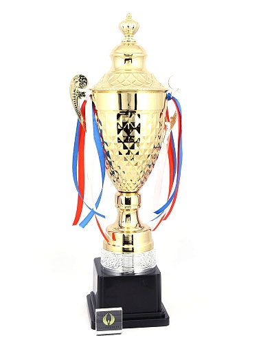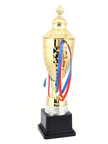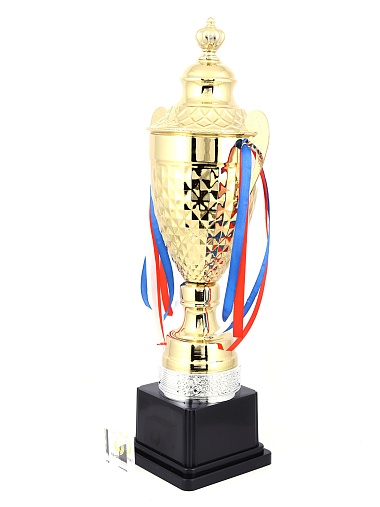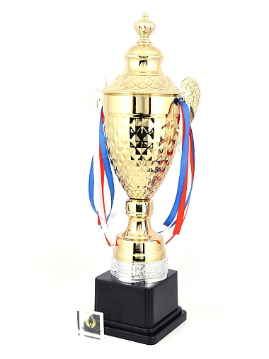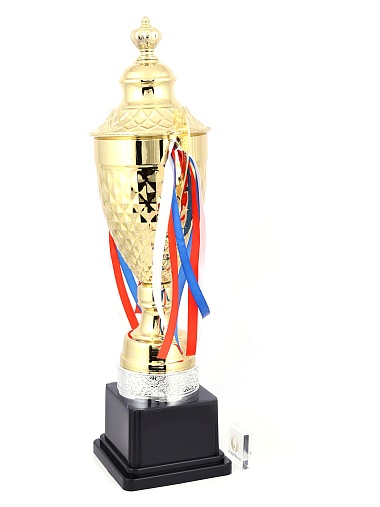 Кубок с металлической чашей, ножкой и крышкой на пластиковом постаменте. Ленточки из полиэстера украшают ручки кубка, но при необходимости их легко можно снять.