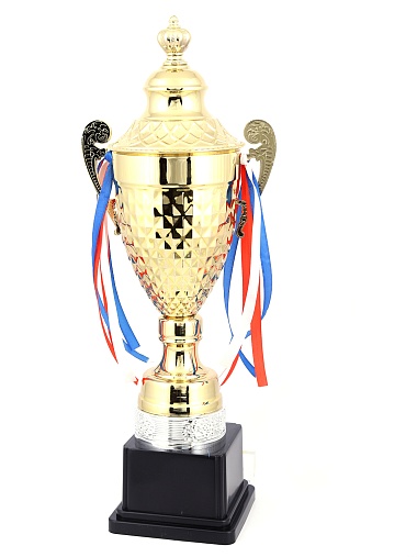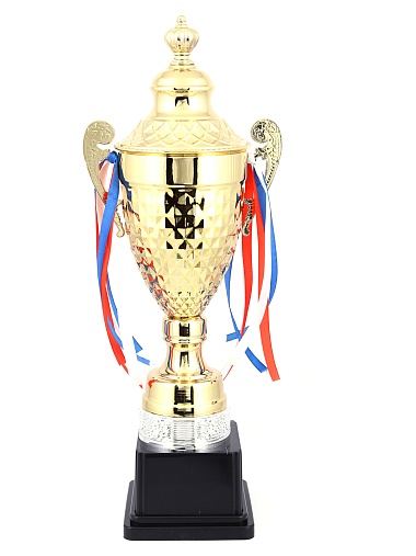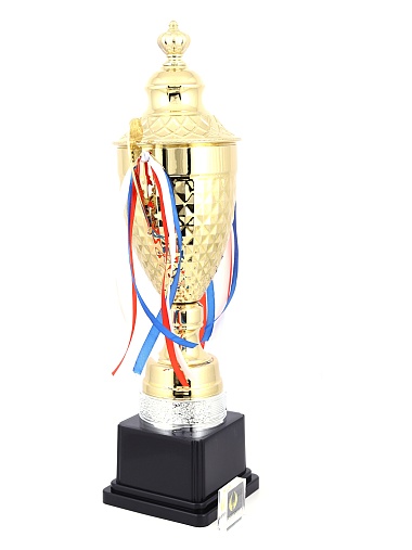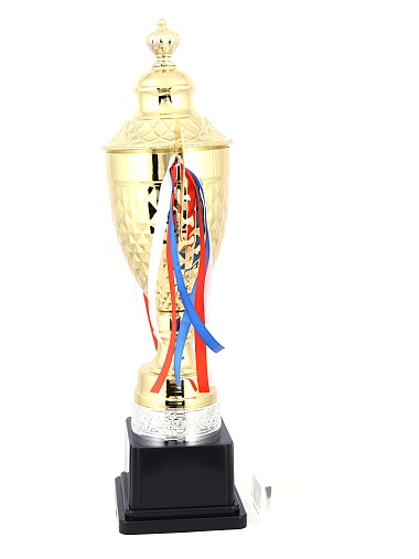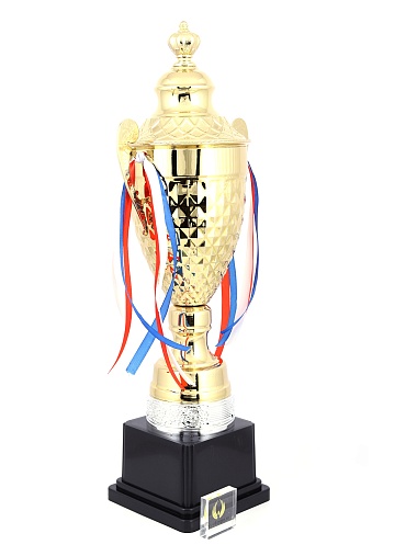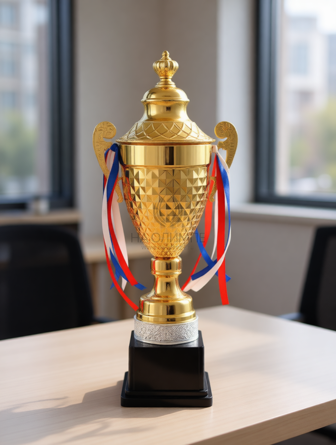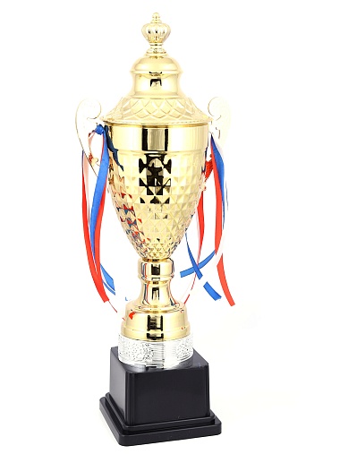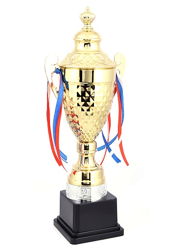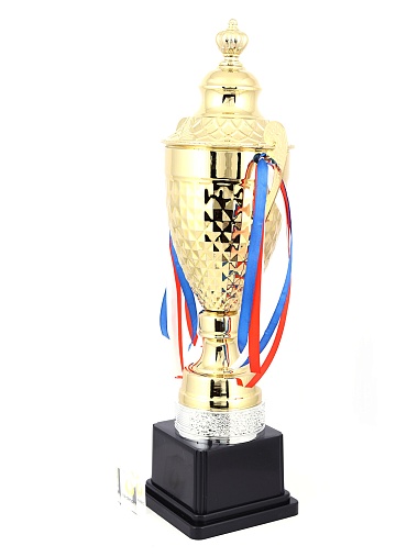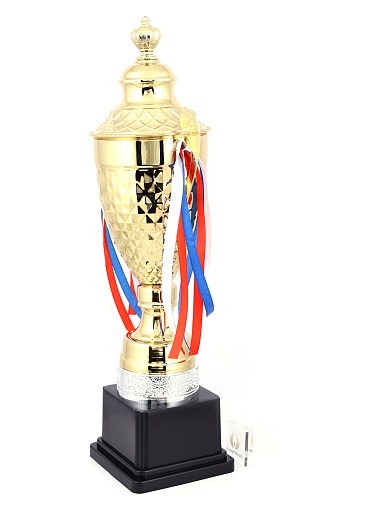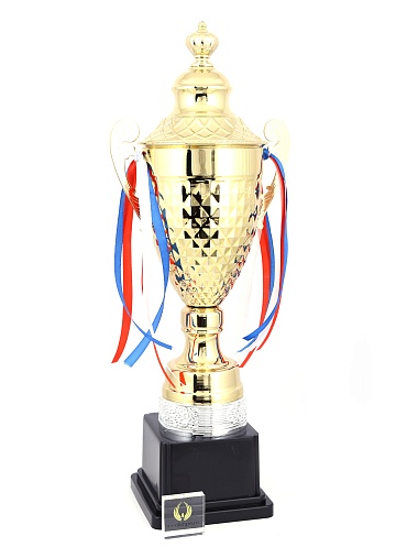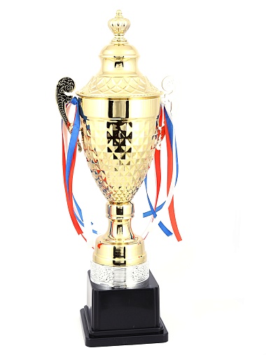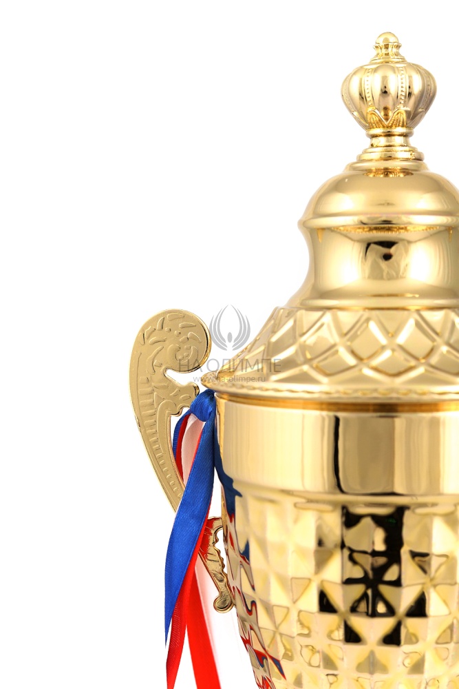 Кубок с металлической чашей, ножкой и крышкой на пластиковом постаменте. Ленточки из полиэстера украшают ручки кубка, но при необходимости их легко можно снять.