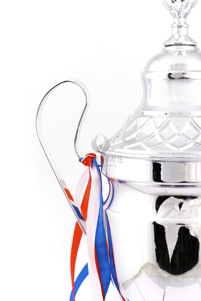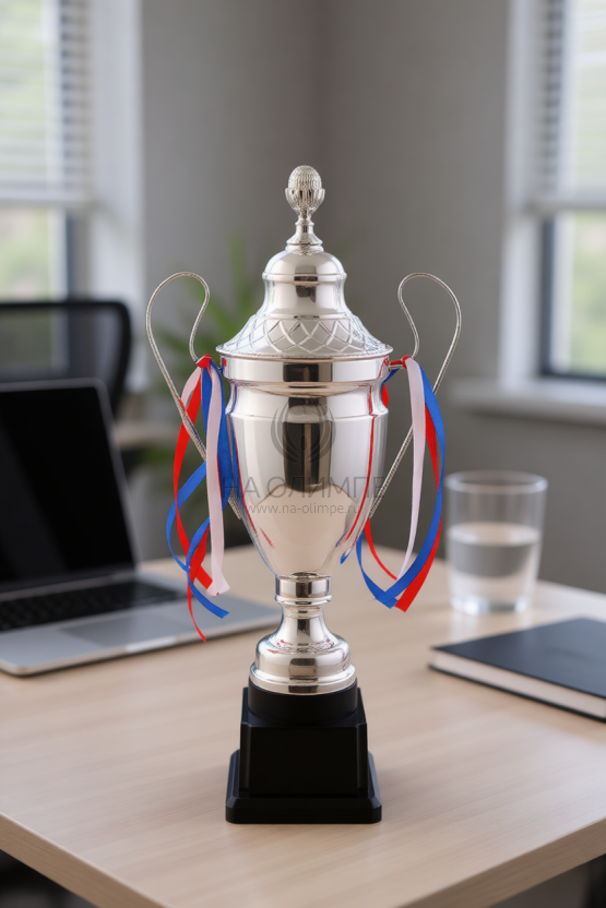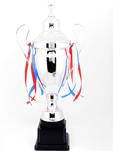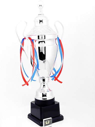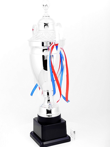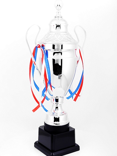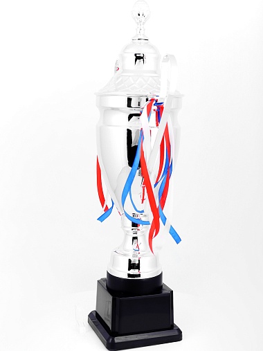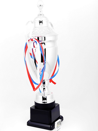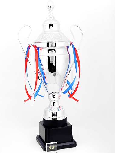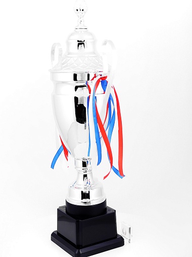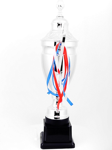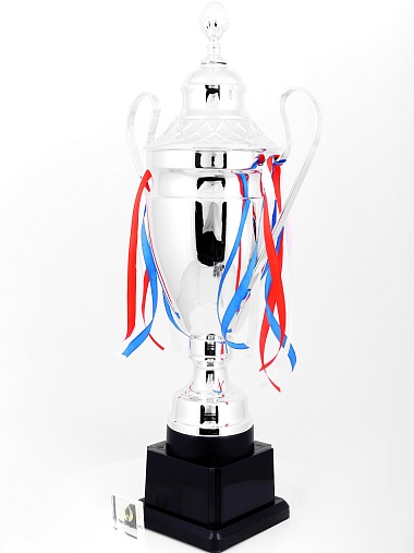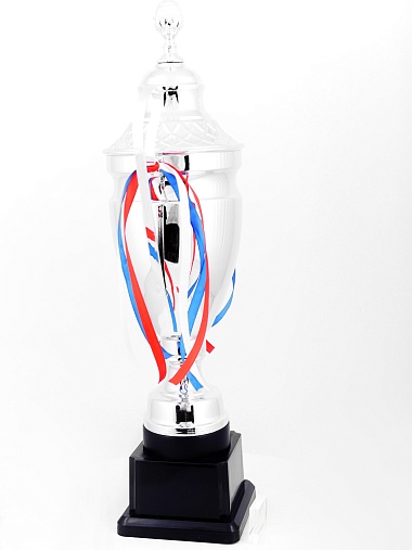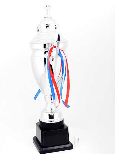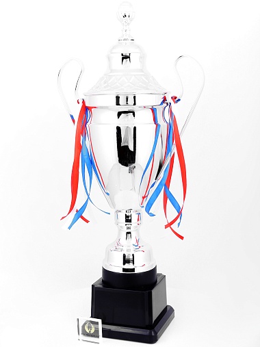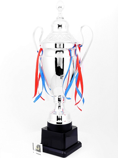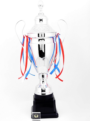 Кубок с металлической чашей, ножкой и крышкой на пластиковом постаменте. Ленточки из полиэстера украшают ручки кубка, но при необходимости их легко можно снять.