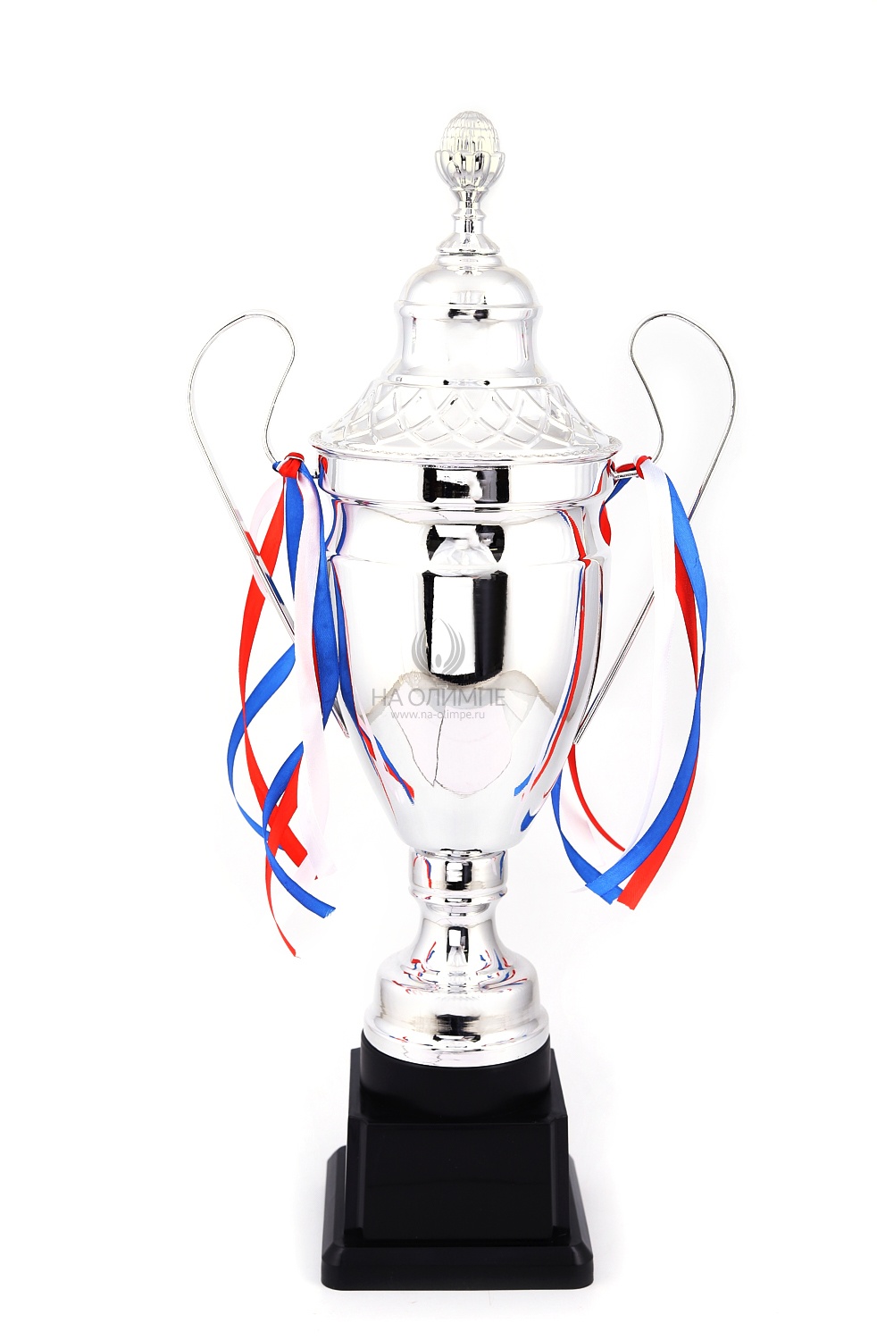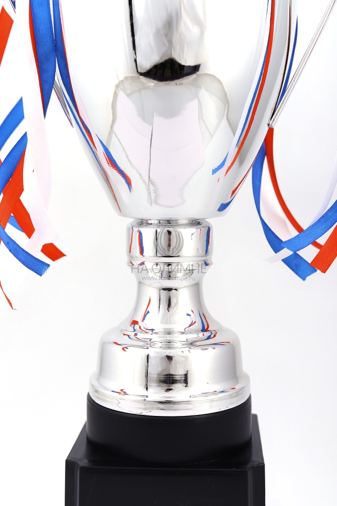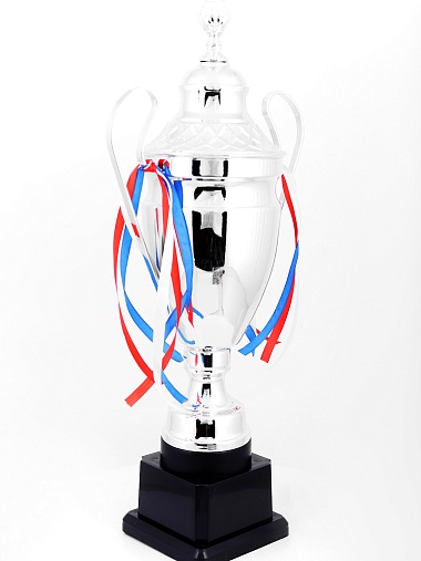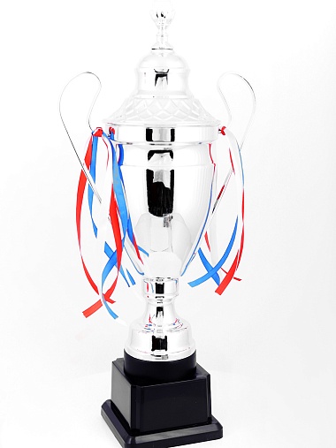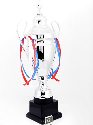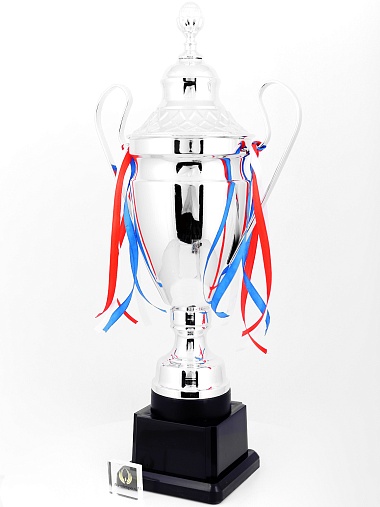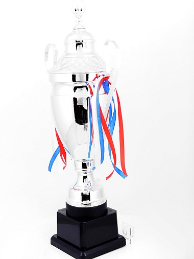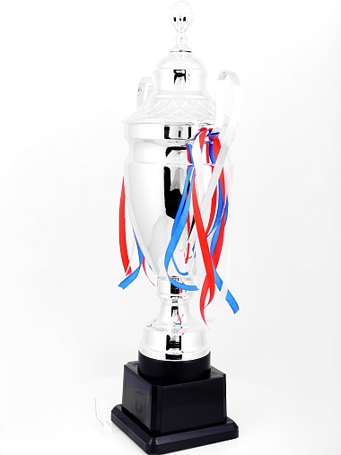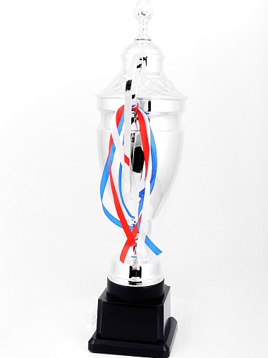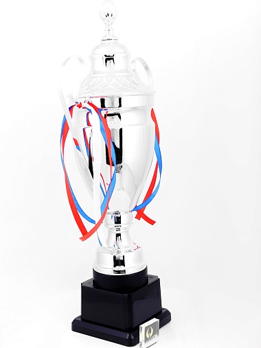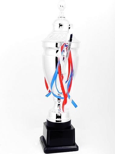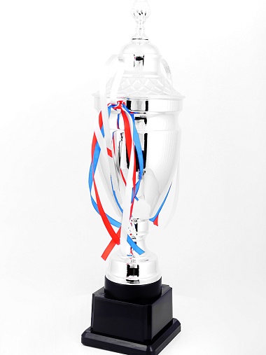 Кубок с металлической чашей, ножкой и крышкой на пластиковом постаменте. Ленточки из полиэстера украшают ручки кубка, но при необходимости их легко можно снять.