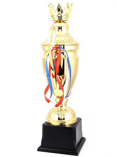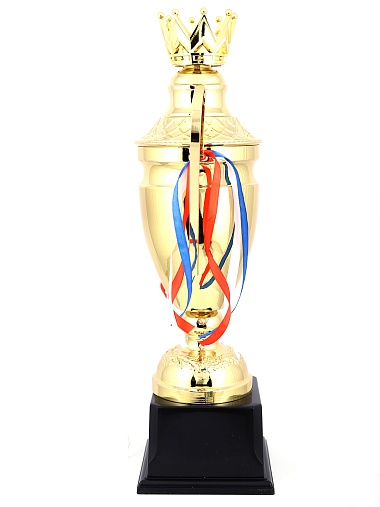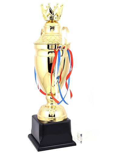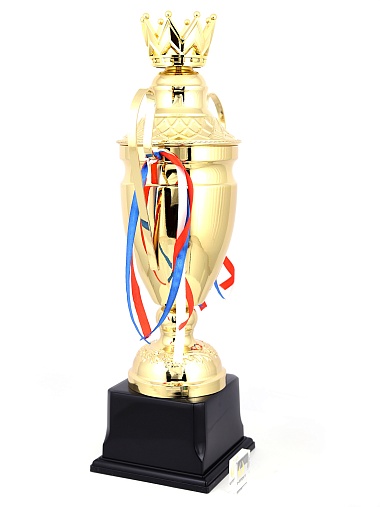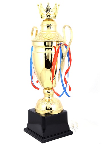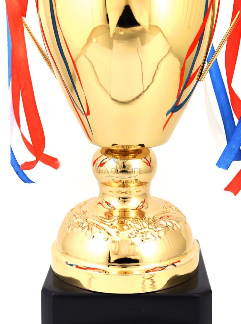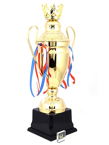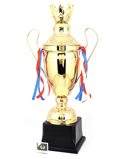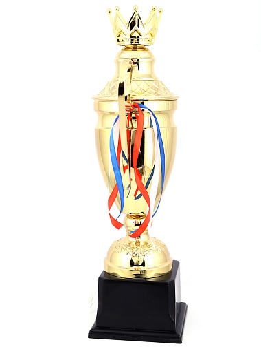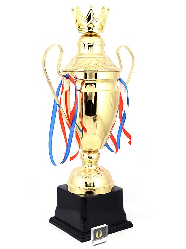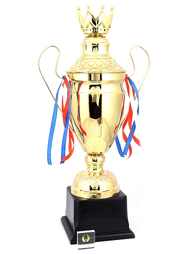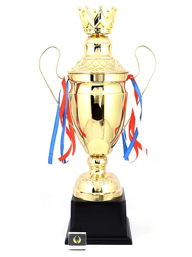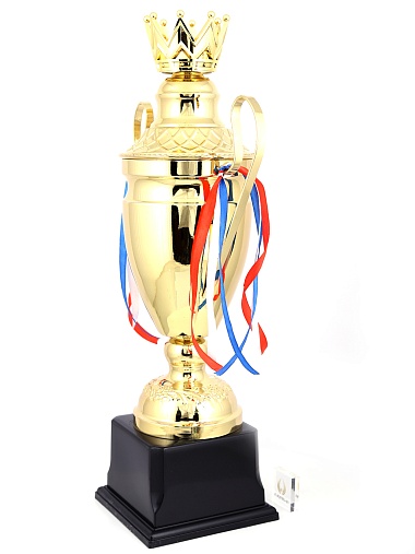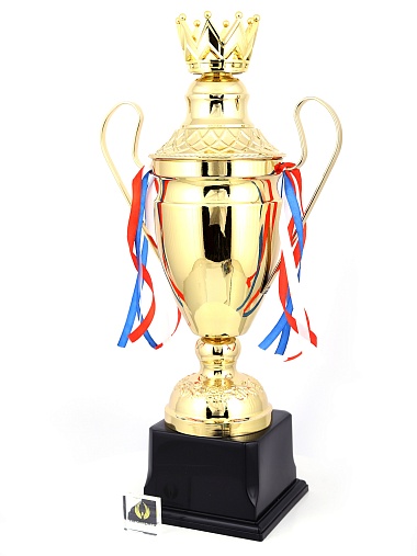 Кубок с металлической чашей, ножкой и крышкой на пластиковом постаменте. Ленточки из полиэстера украшают ручки кубка, но при необходимости их легко можно снять.