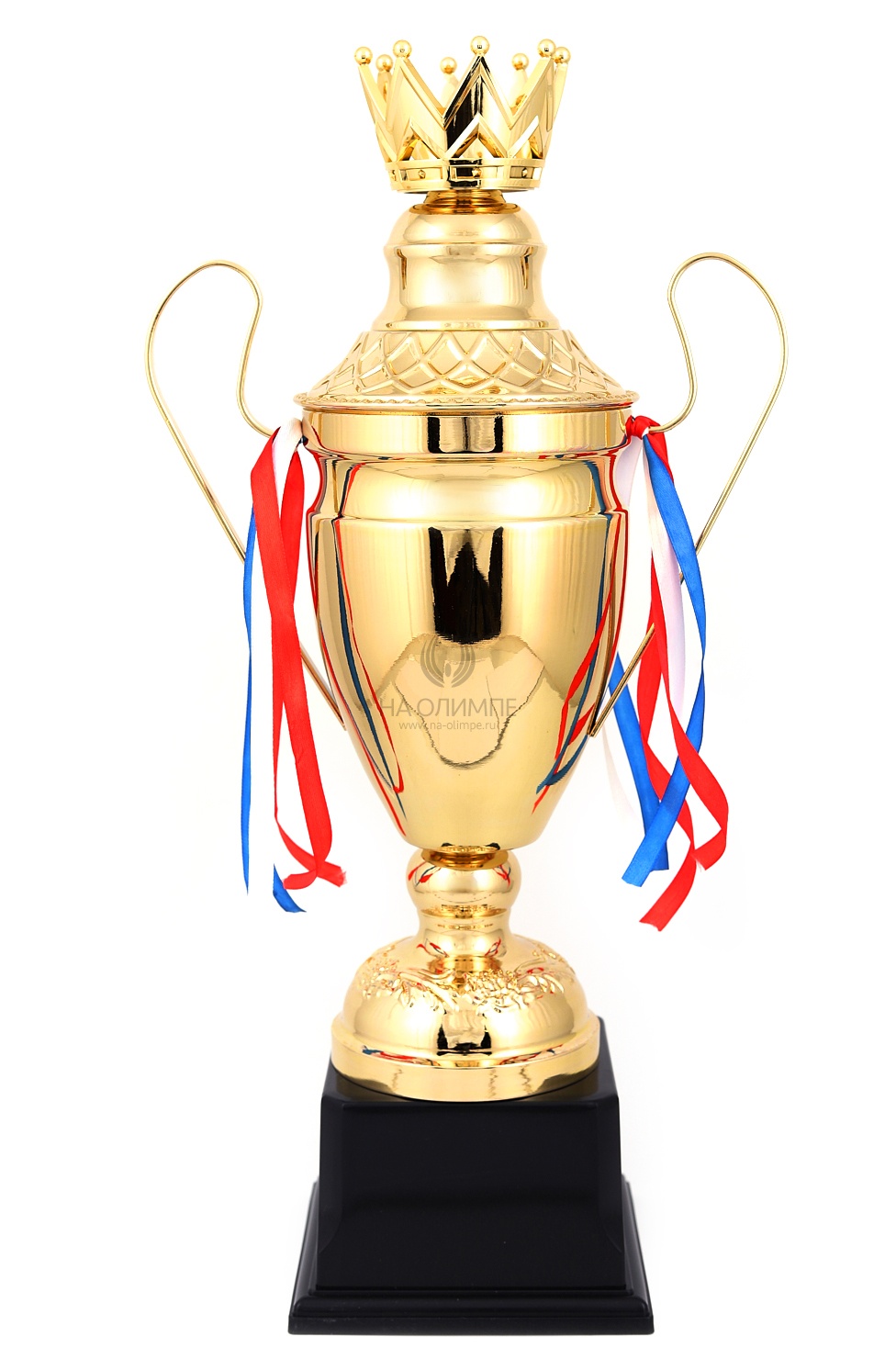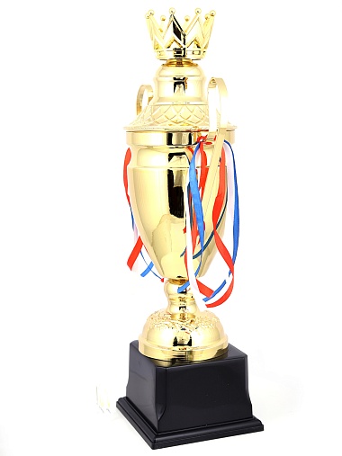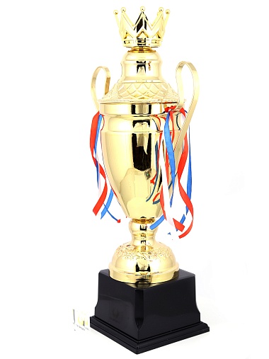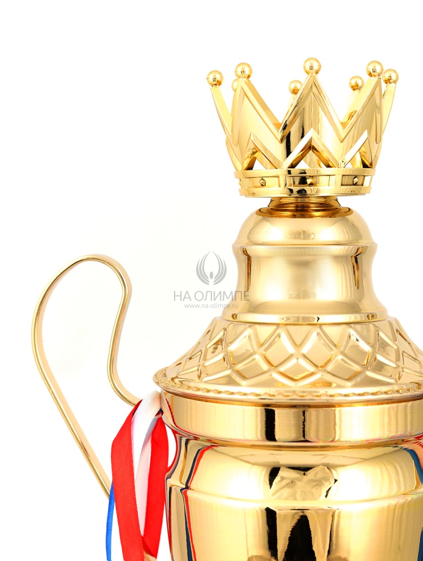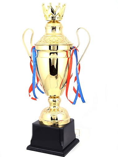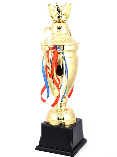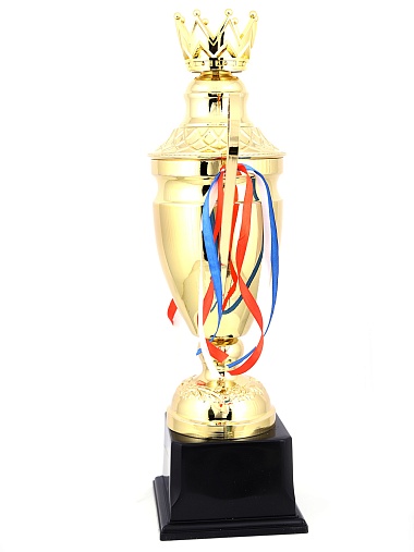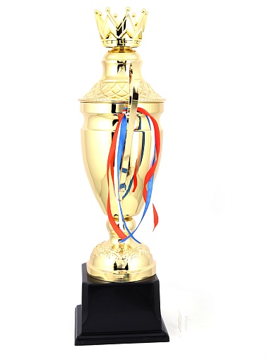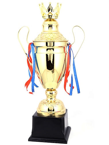 Кубок с металлической чашей, ножкой и крышкой на пластиковом постаменте. Ленточки из полиэстера украшают ручки кубка, но при необходимости их легко можно снять.