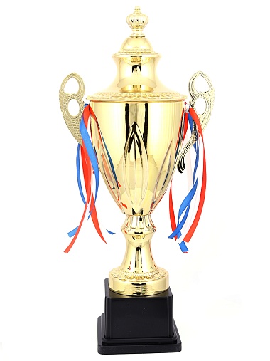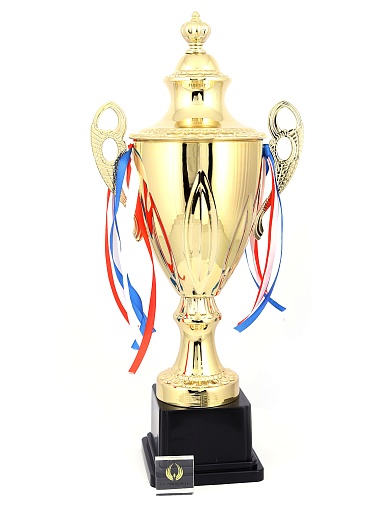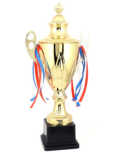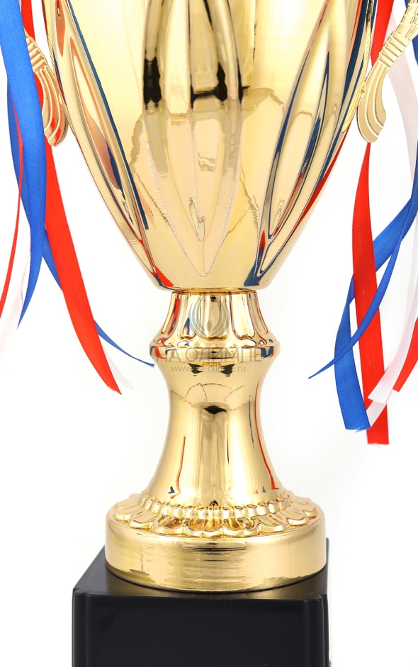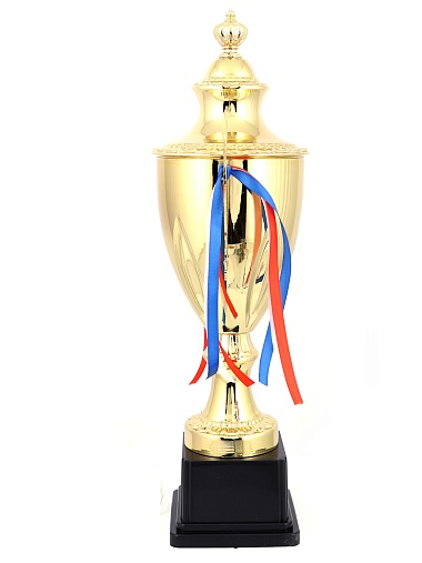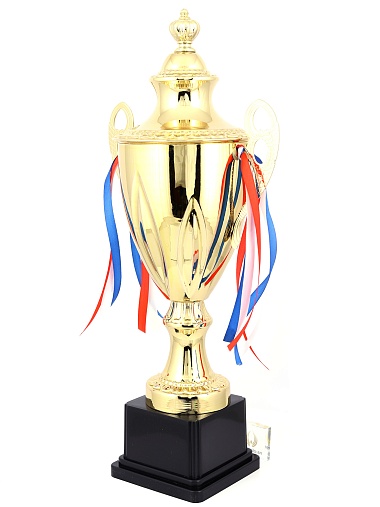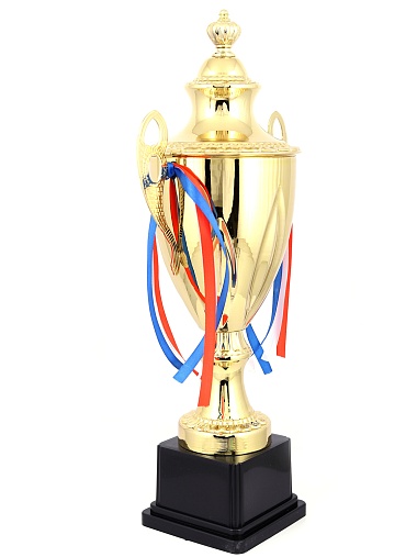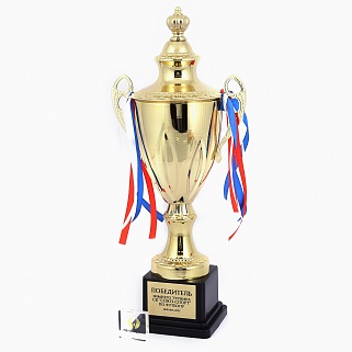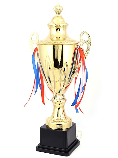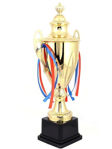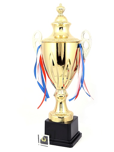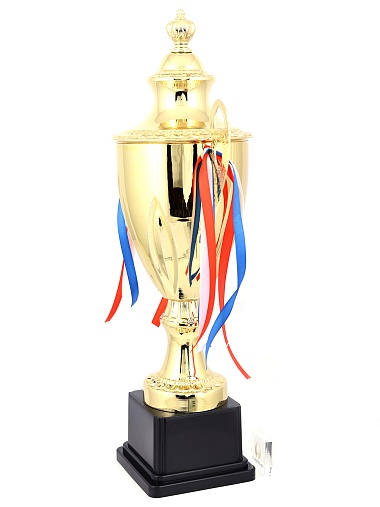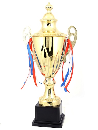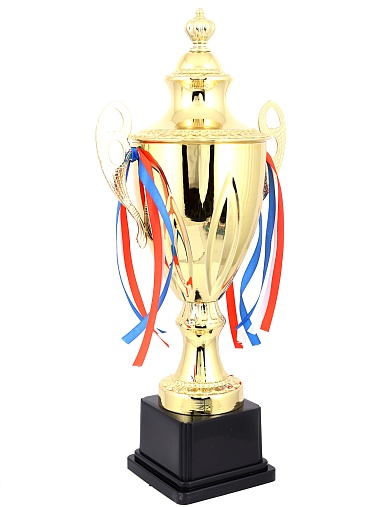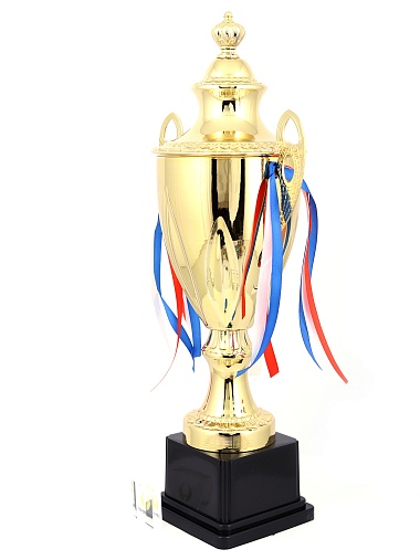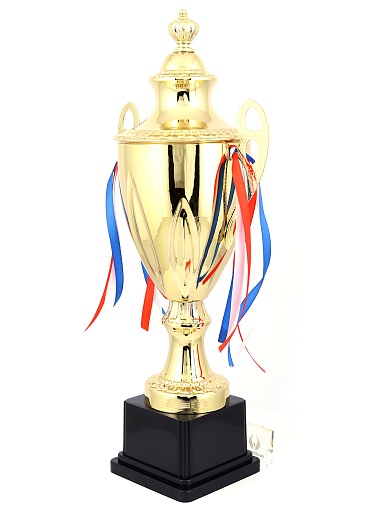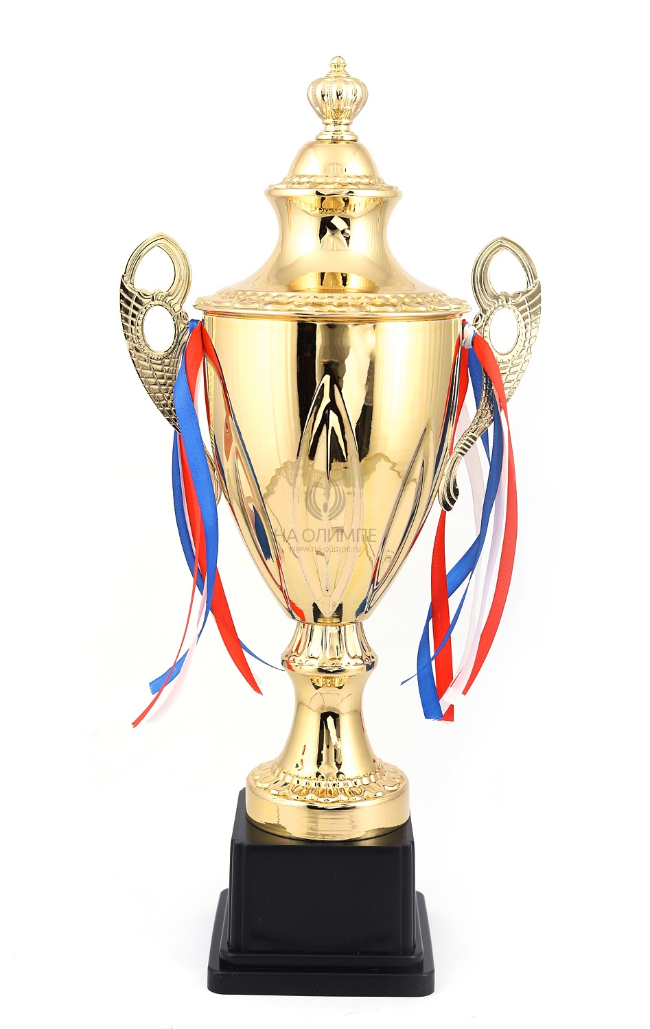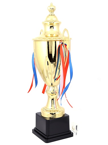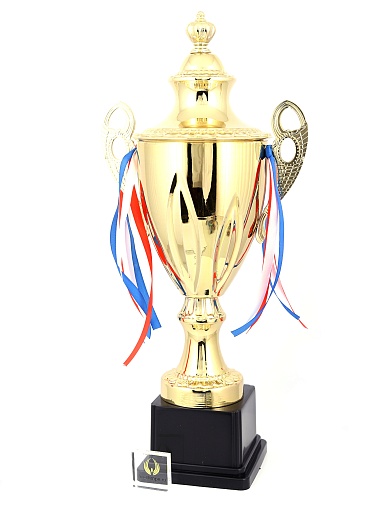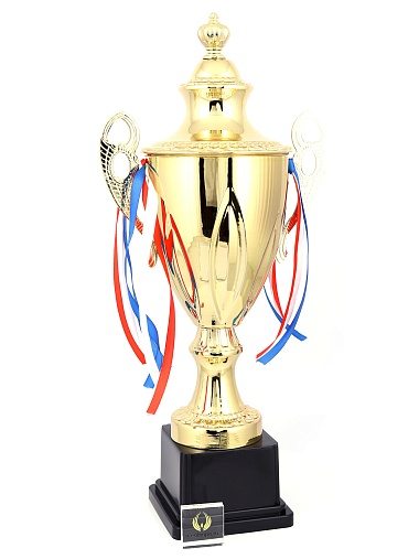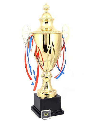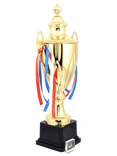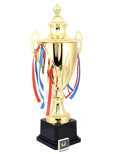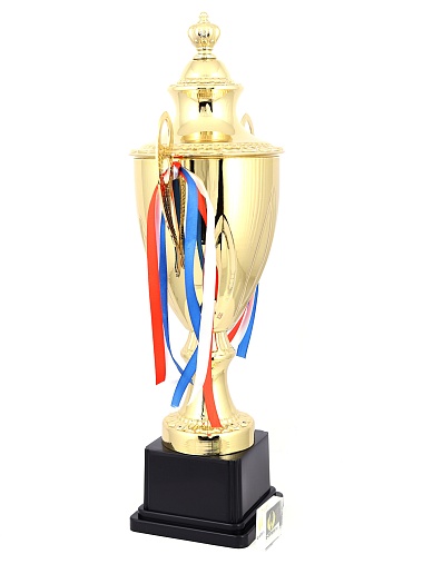 Кубок с металлической чашей, ножкой и крышкой на пластиковом постаменте. Ленточки из полиэстера украшают ручки кубка, но при необходимости их легко можно снять.