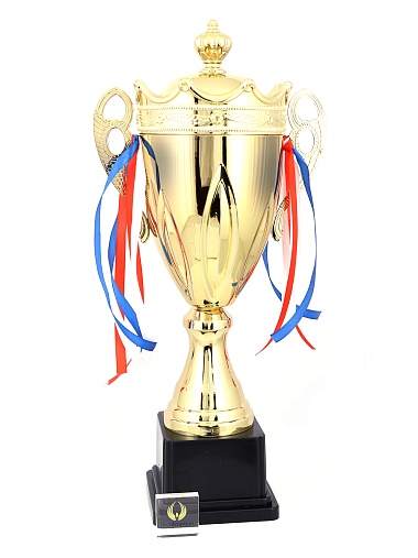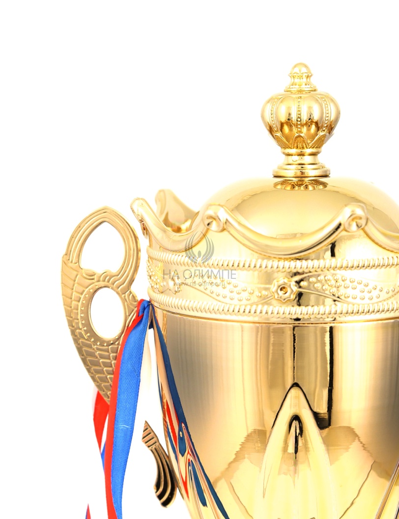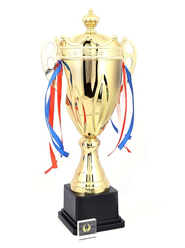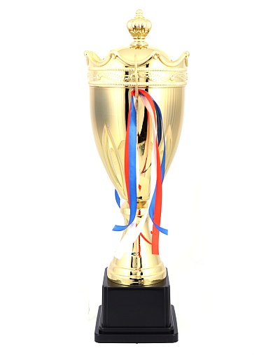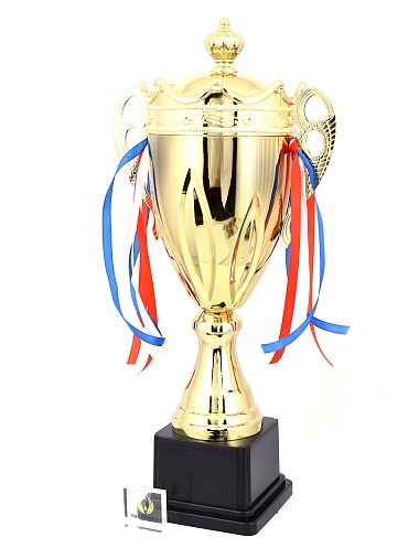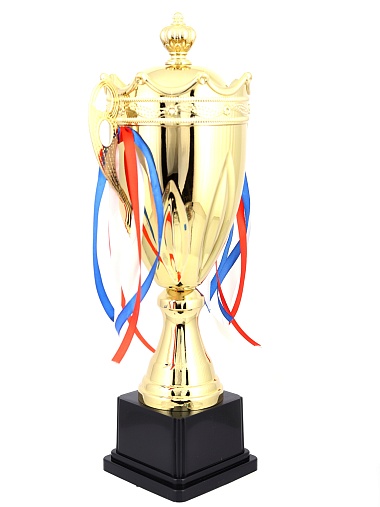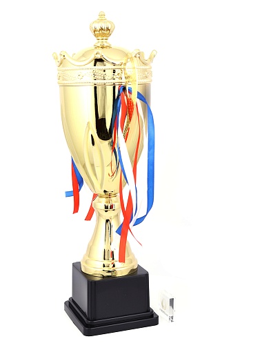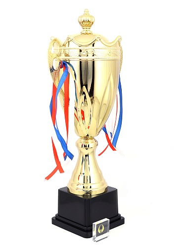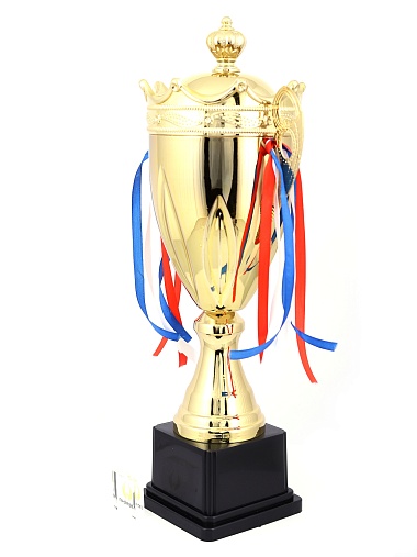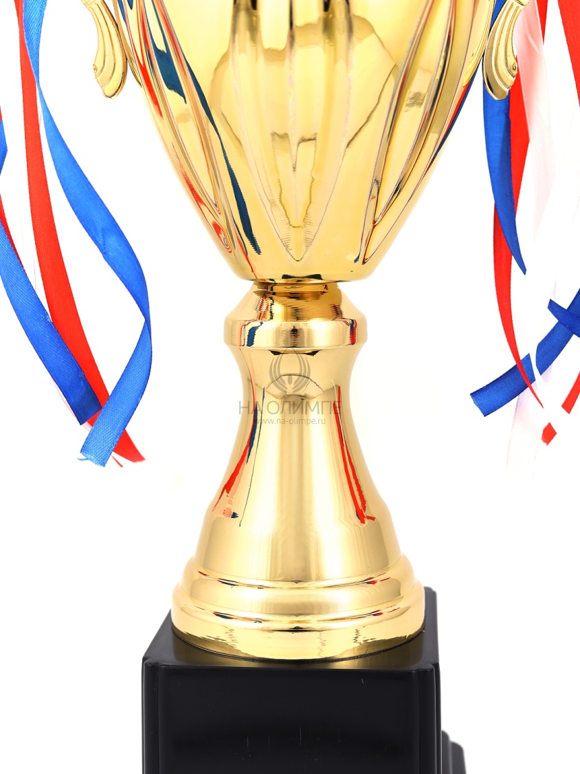 Кубок с металлической чашей и ножкой на пластиковом постаменте. Ленточки из полиэстера украшают ручки кубка, но при необходимости их легко можно снять.