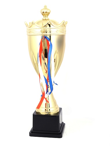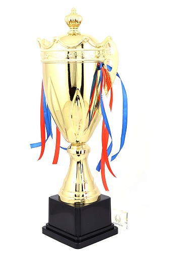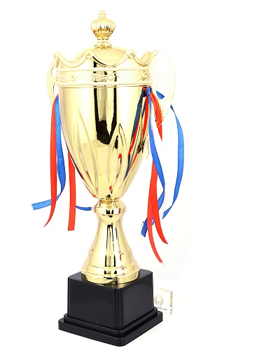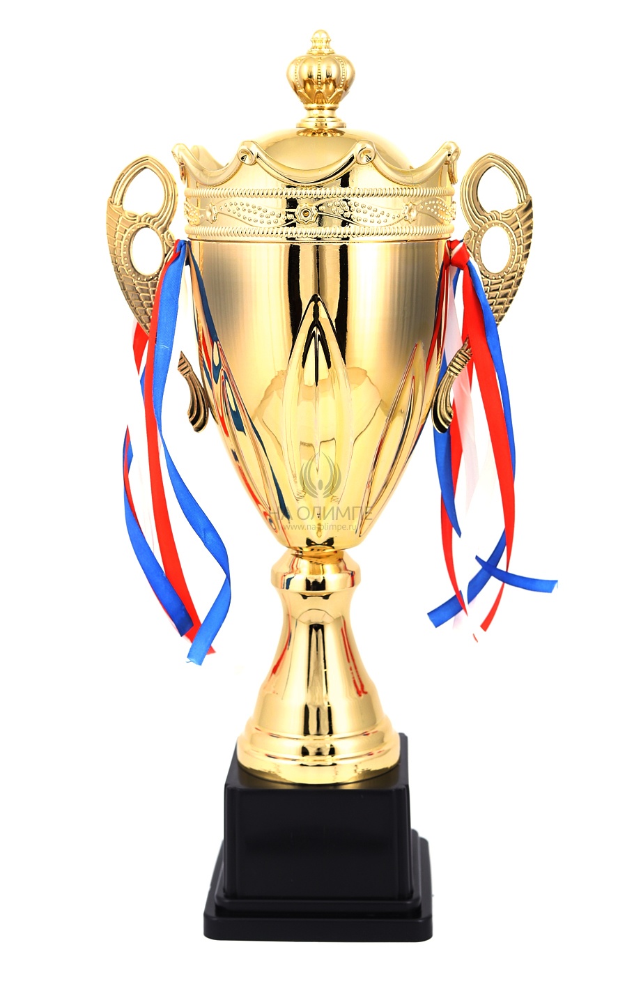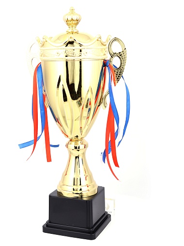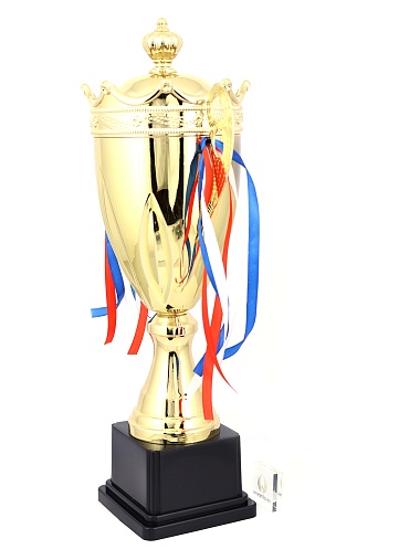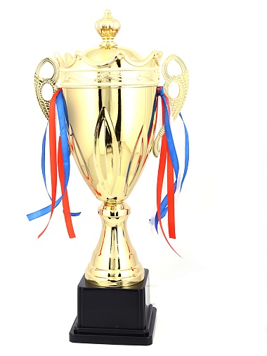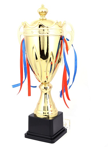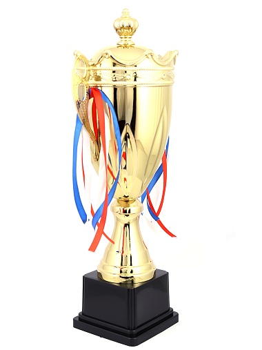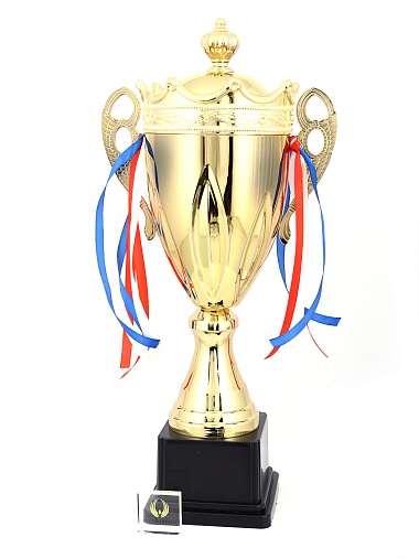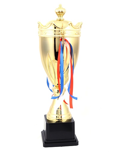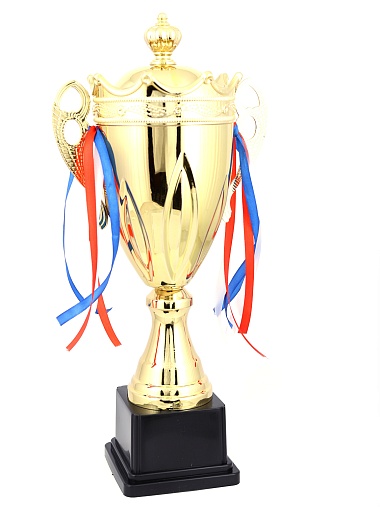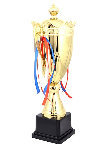 Кубок с металлической чашей и ножкой на пластиковом постаменте. Ленточки из полиэстера украшают ручки кубка, но при необходимости их легко можно снять.