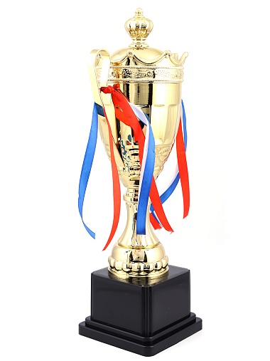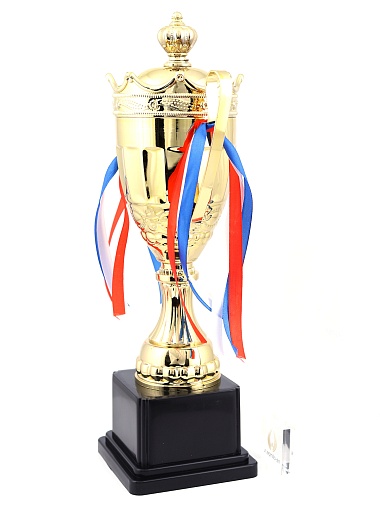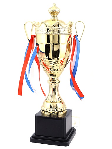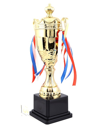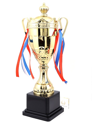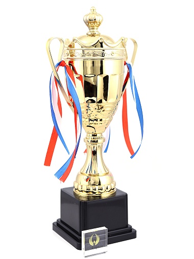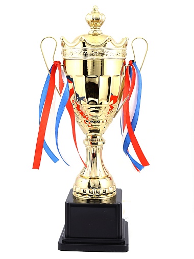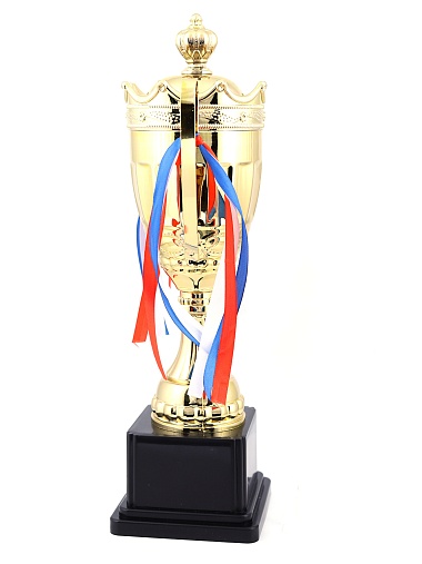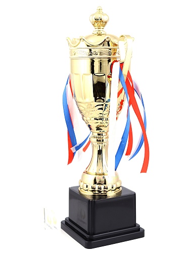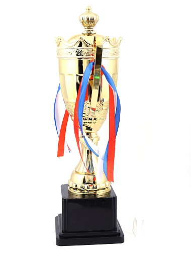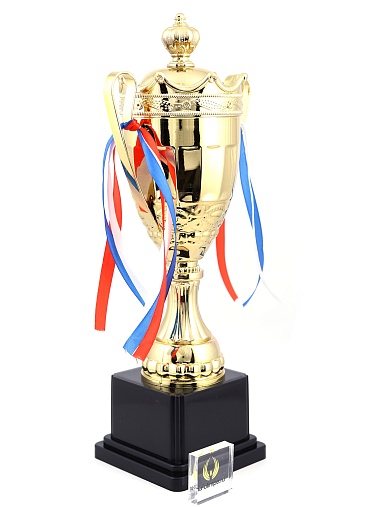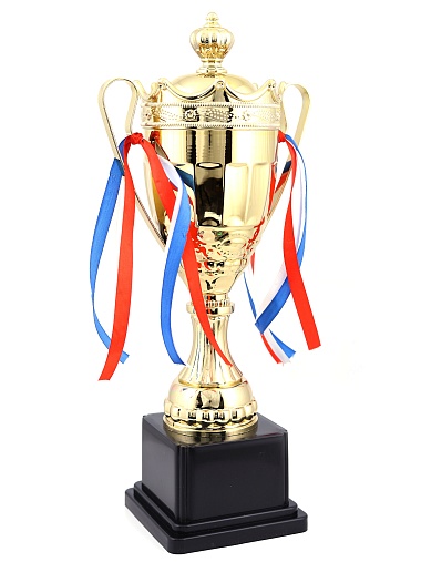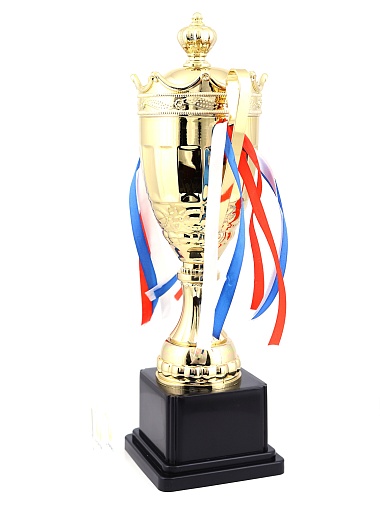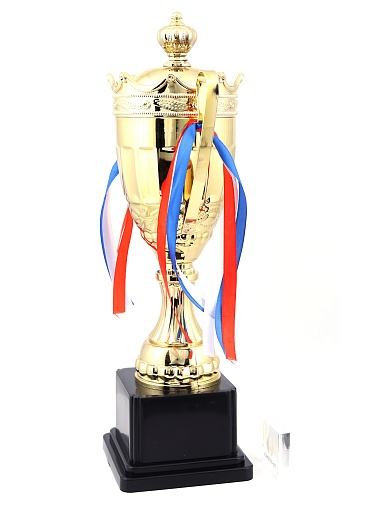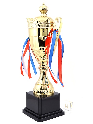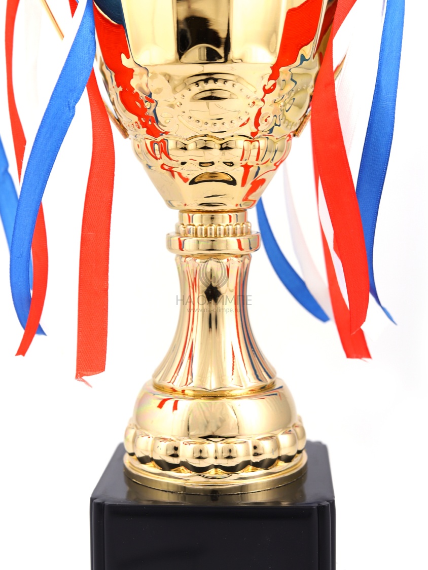 Кубок с металлической чашей на пластиковом постаменте. Ленточки из полиэстера украшают ручки кубка, но при необходимости их легко можно снять.