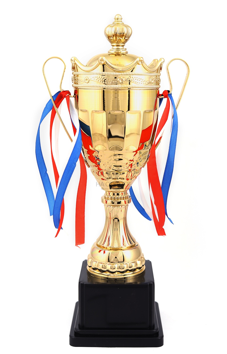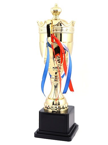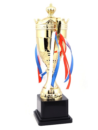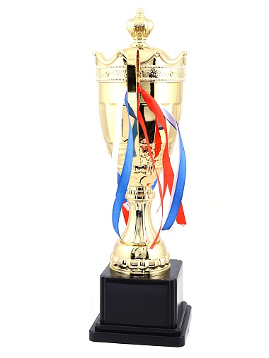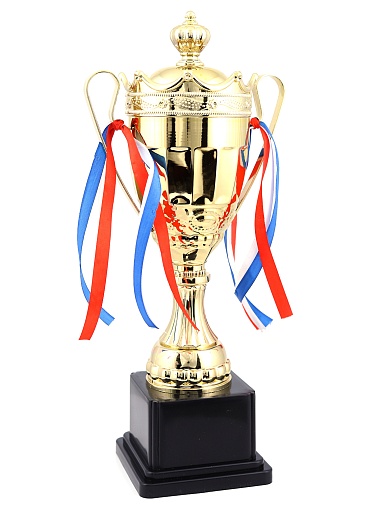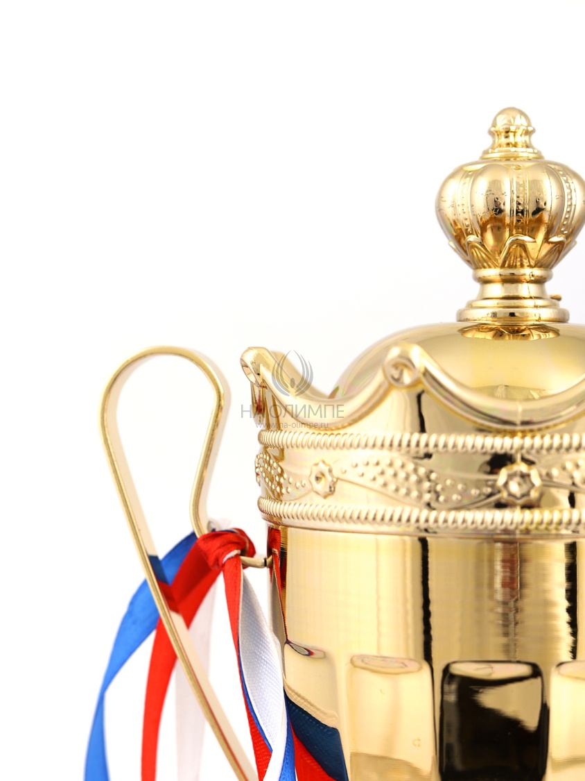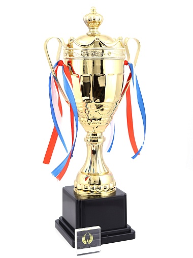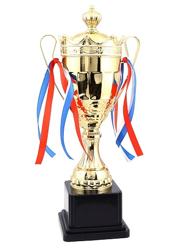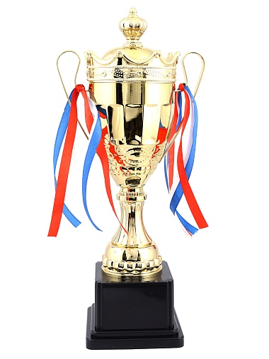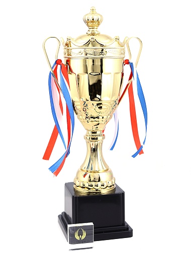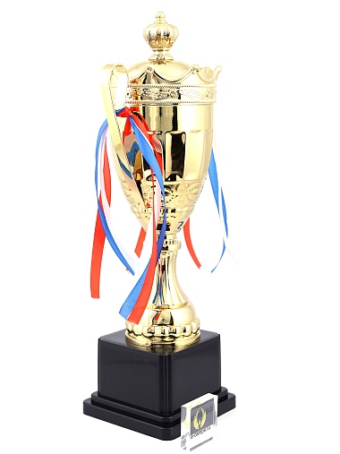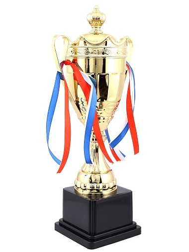 Кубок с металлической чашей на пластиковом постаменте. Ленточки из полиэстера украшают ручки кубка, но при необходимости их легко можно снять.