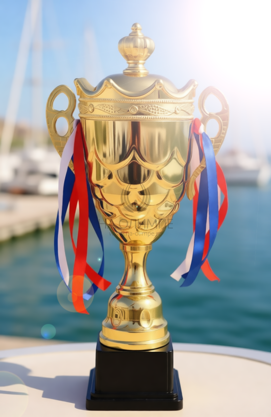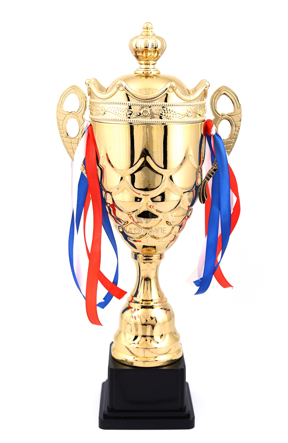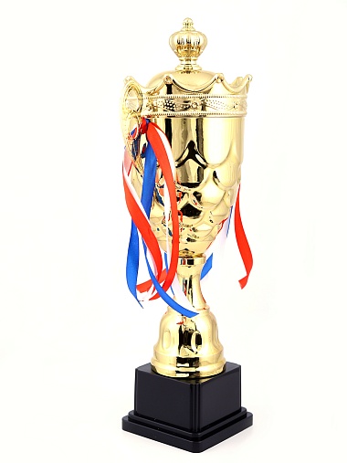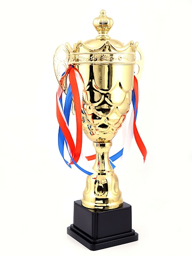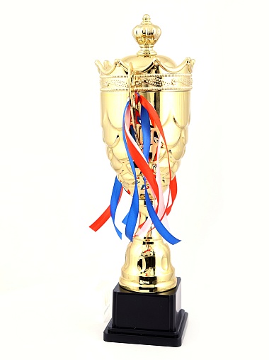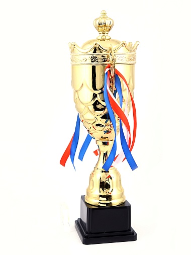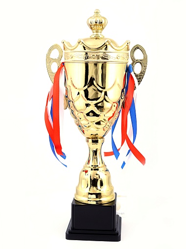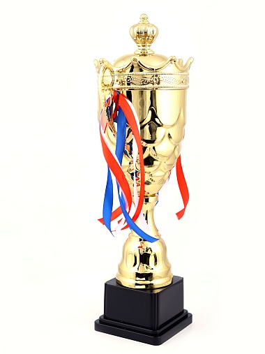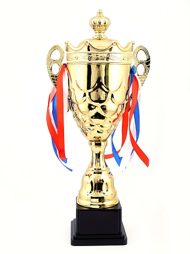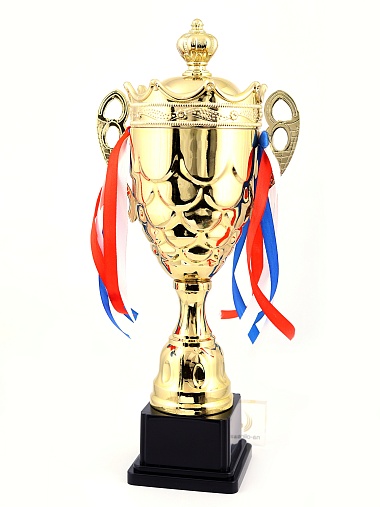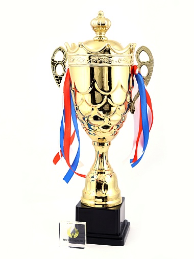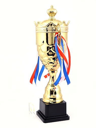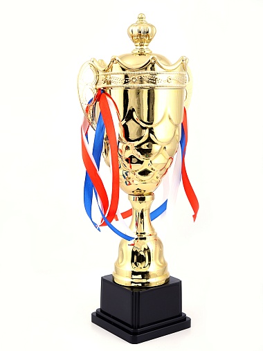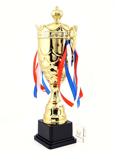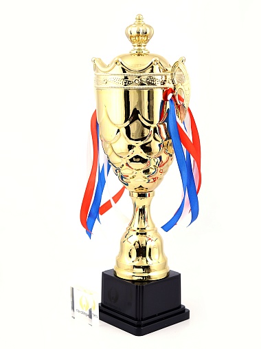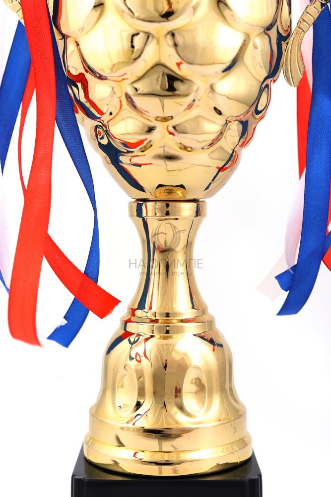 Кубок с металлической чашей на пластиковом постаменте. Ленточки из полиэстера украшают ручки кубка, но при необходимости их легко можно снять.