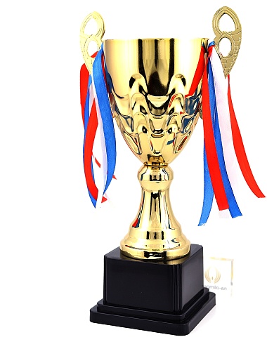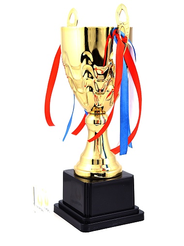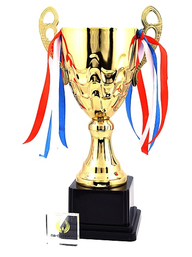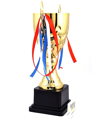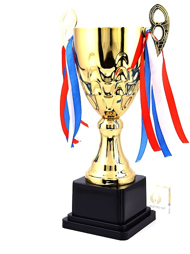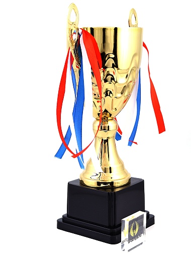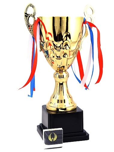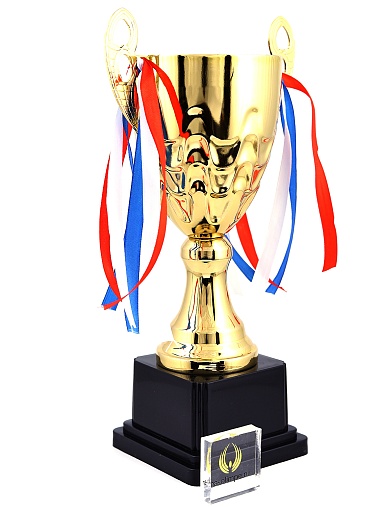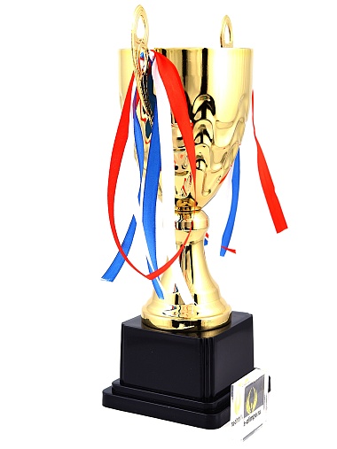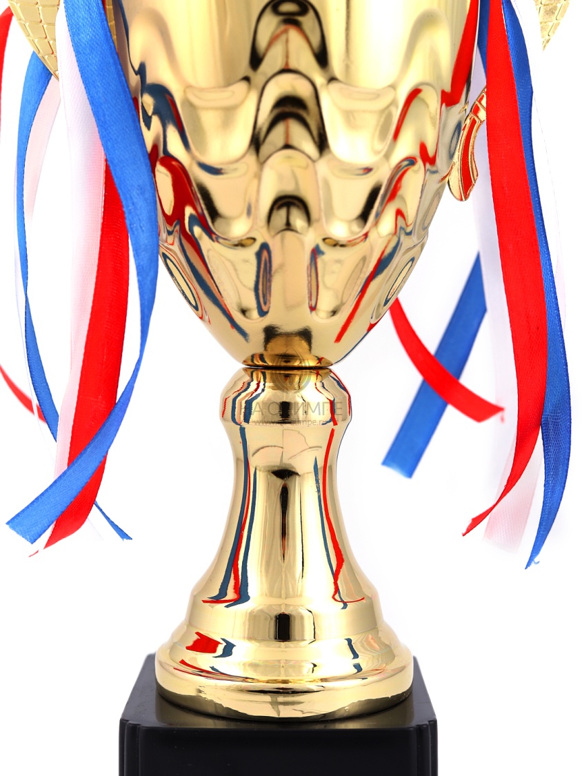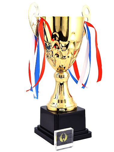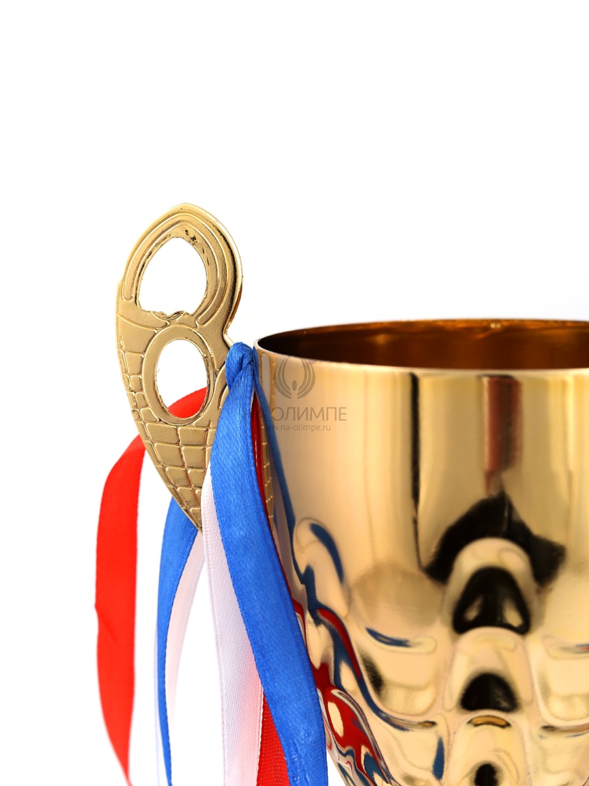 Кубок с металлической чашей, ножкой и крышкой на пластиковом постаменте. Ленточки из полиэстера украшают ручки кубка, но при необходимости их легко можно снять.