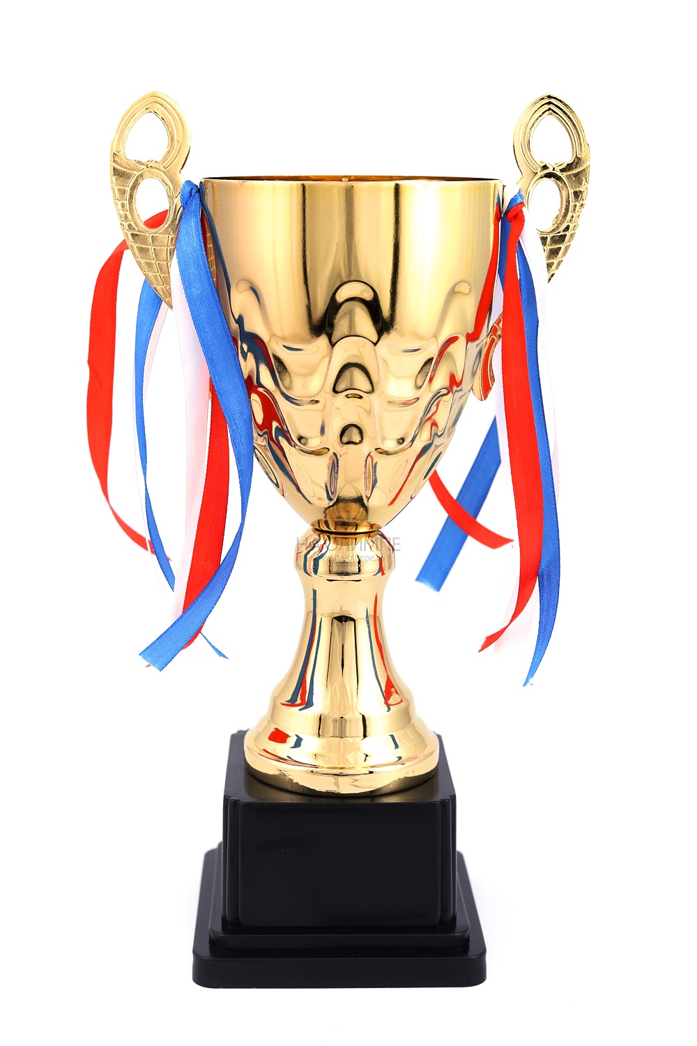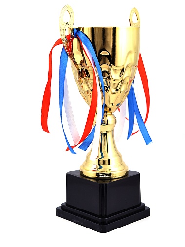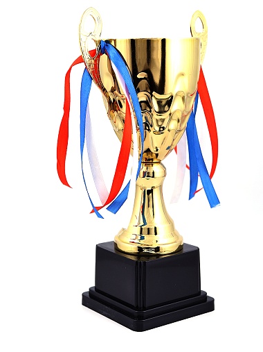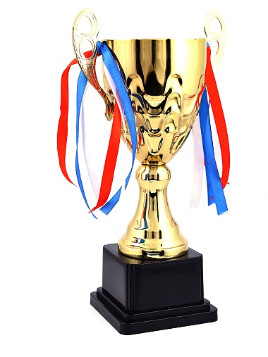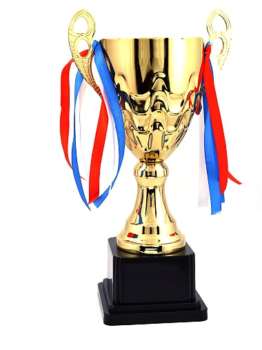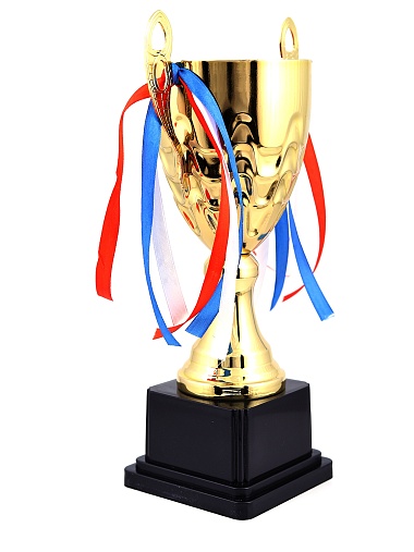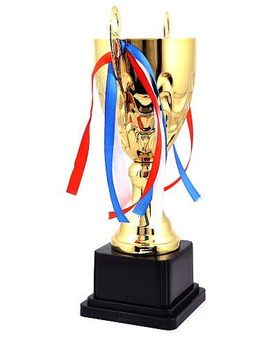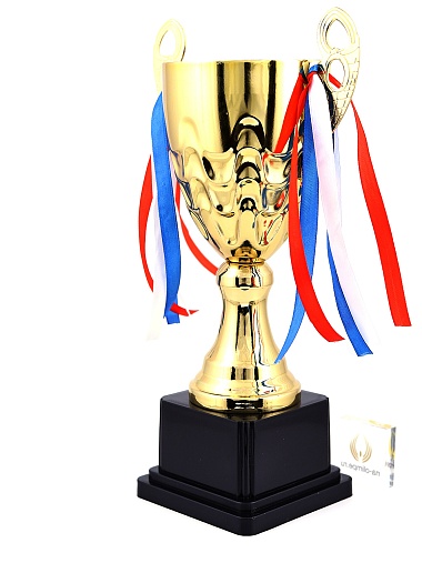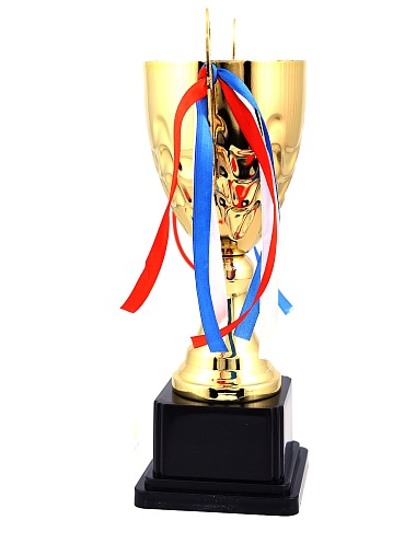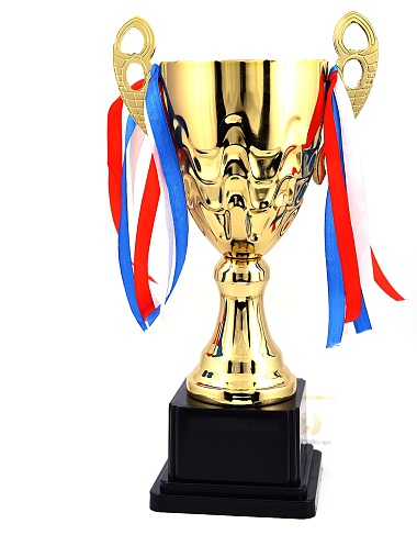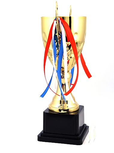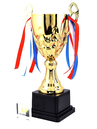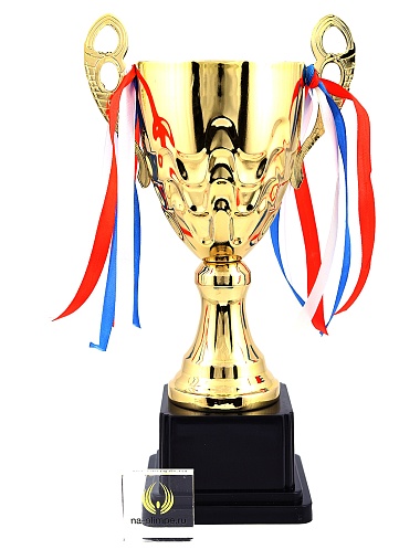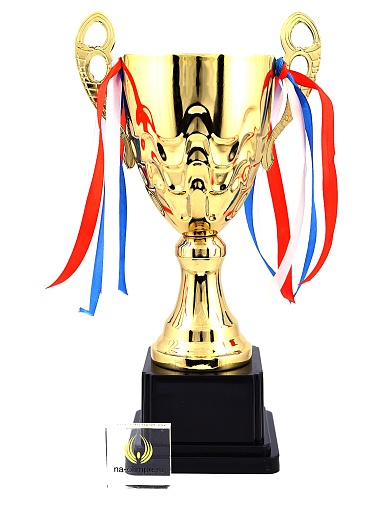 Кубок с металлической чашей, ножкой и крышкой на пластиковом постаменте. Ленточки из полиэстера украшают ручки кубка, но при необходимости их легко можно снять.