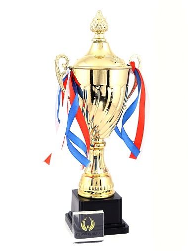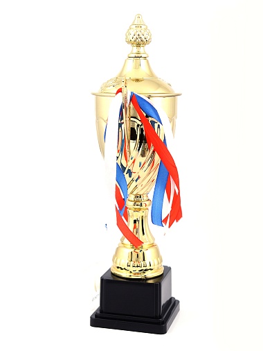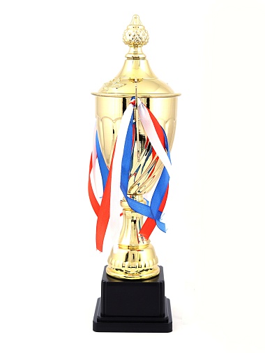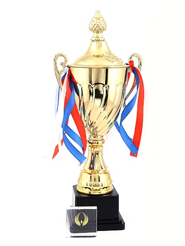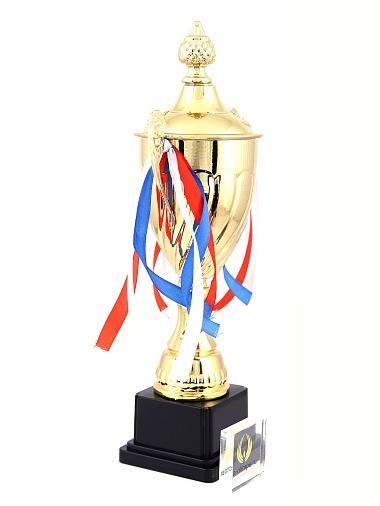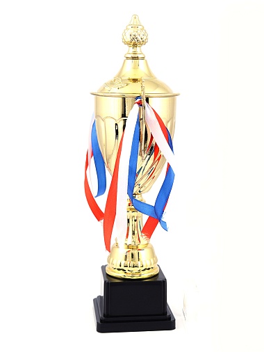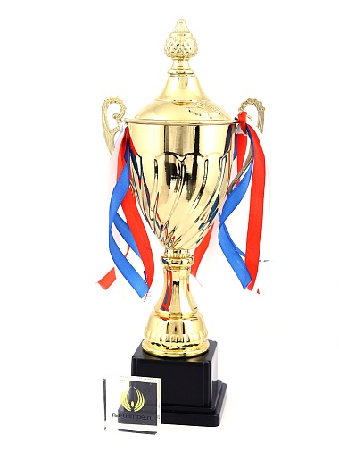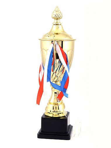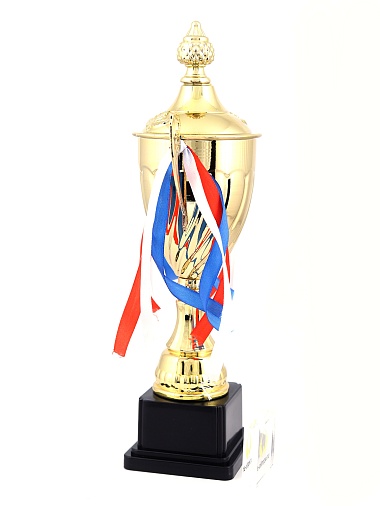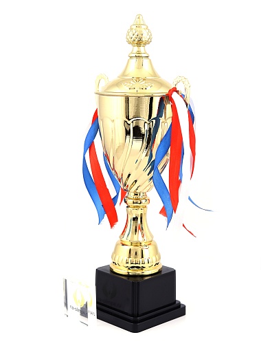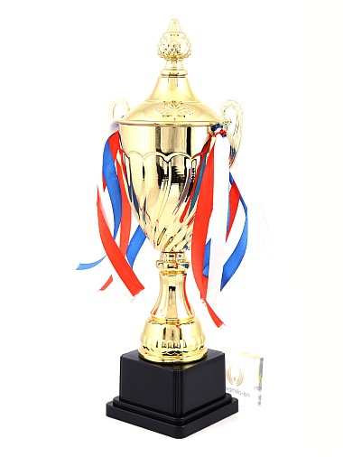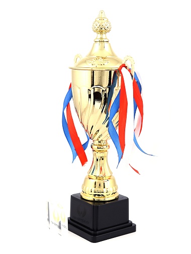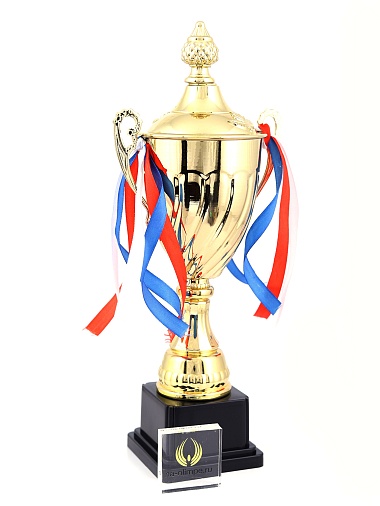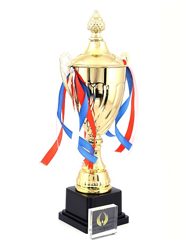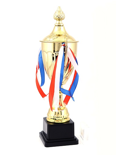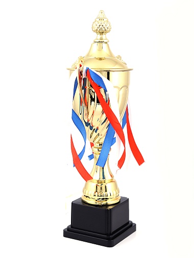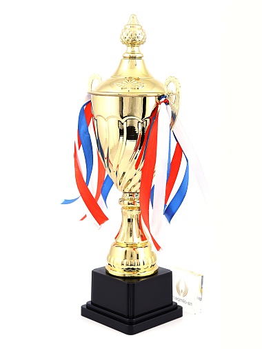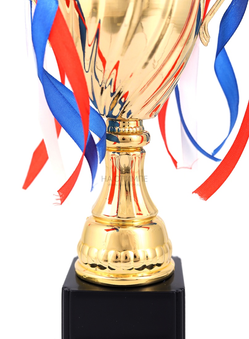 Кубок с металлической чашей на пластиковом постаменте. Ленточки из полиэстера украшают ручки кубка, но при необходимости их легко можно снять.