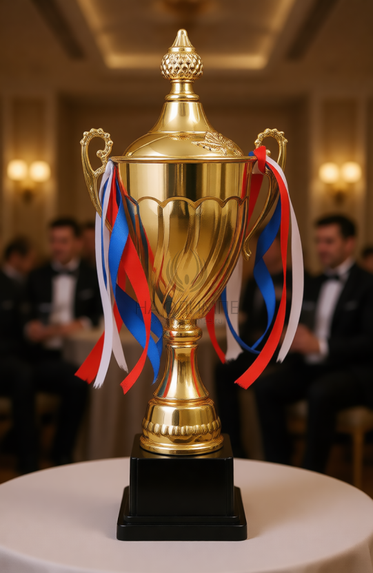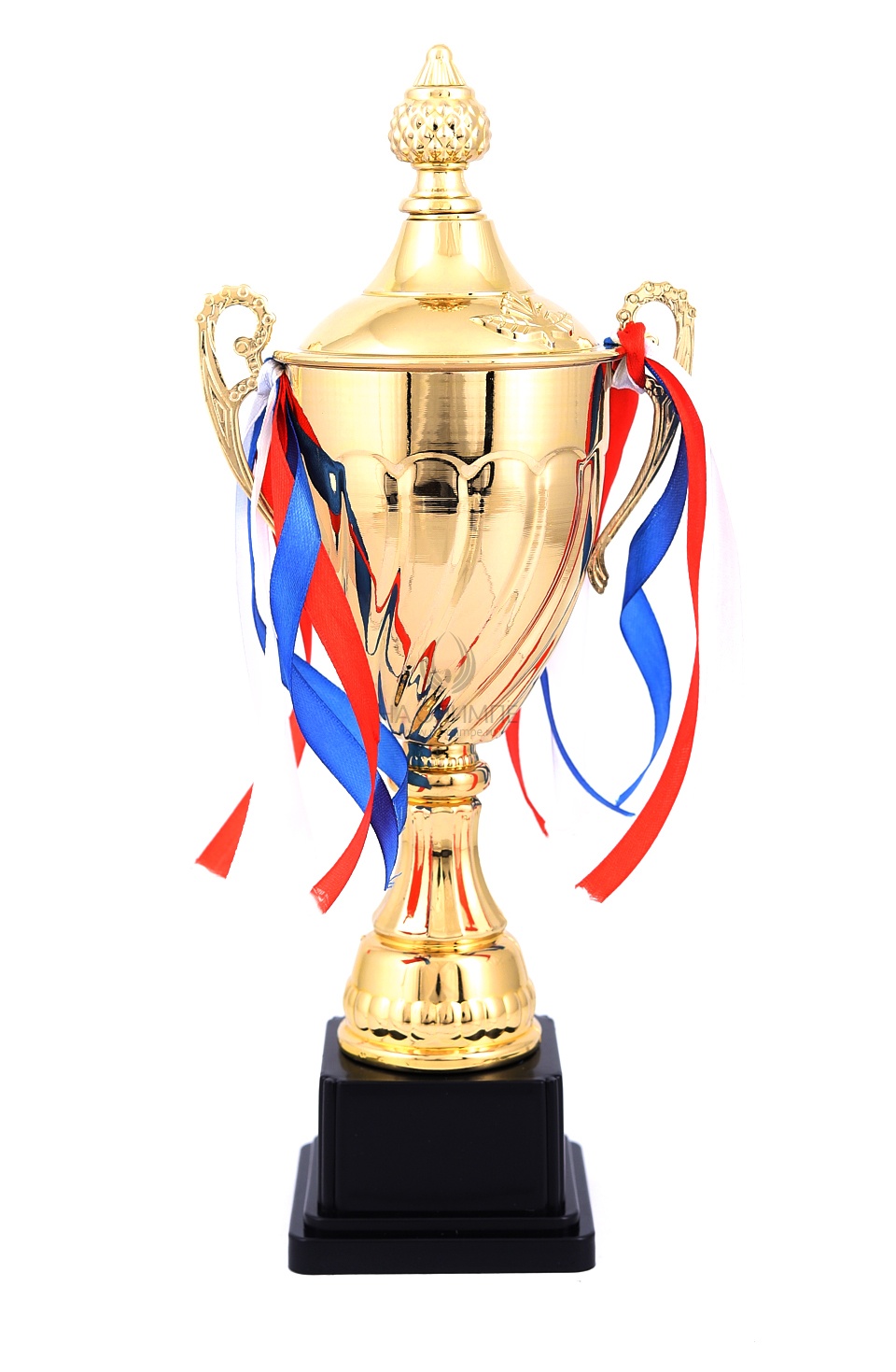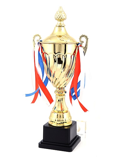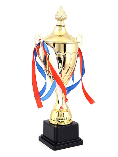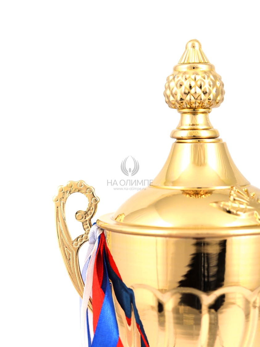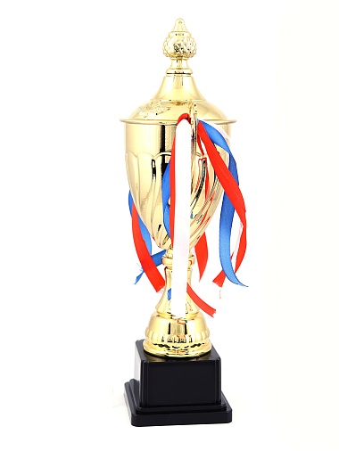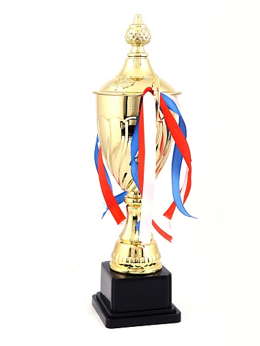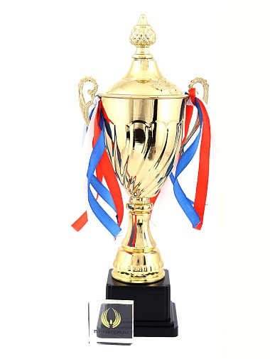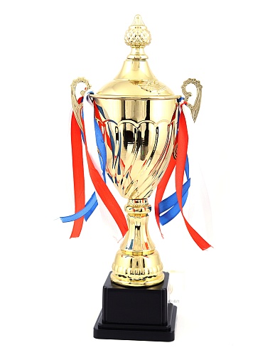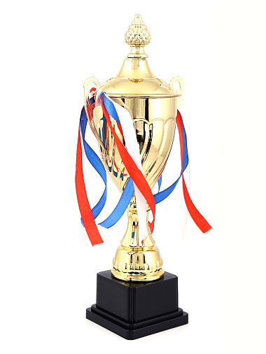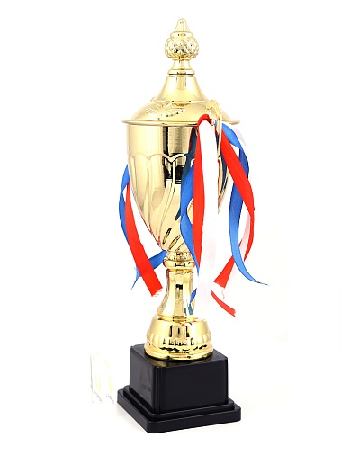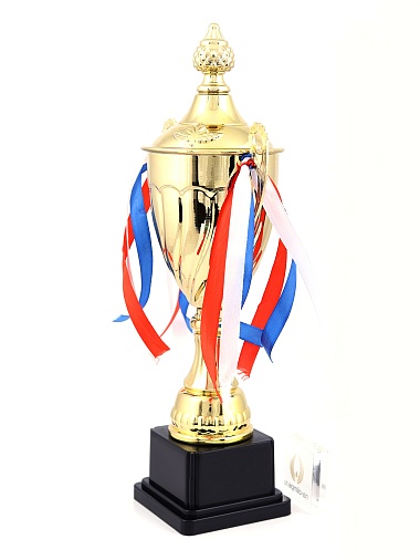Кубок с металлической чашей на пластиковом постаменте. Ленточки из полиэстера украшают ручки кубка, но при необходимости их легко можно снять.