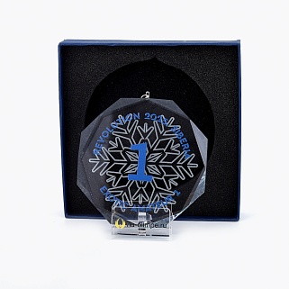 Медаль из стекла, толщиной 10 мм. с полноцветной печатью. Печать выполняется на uv-принтере уф-отверждаемыми чернилами. Изображение не выцветает и не желтеет со временем. Высокое качество печати позволяет наносить изображения с большой детализацией, любых цветов включая белый. Изображение наносится на обратную сторону медали дважды, при этом в первый раз зеркально. Благодаря этому информация на медали читается как спереди так и сзади. Например спереди может быть размещена информация о награждаемом человеке, номинация, логотип, а перевернув медаль, мы увидим слова поздравления. Однако обязательным условием подобной техники печати является полностью закрашенный фон, это нужно для того, чтобы передняя печать не мешала читаемости задней. Несомненным плюсом этого способа печати является возможность разместить большое количество информации на одной награде. Диаметр медали равен 100мм. Вес медали без футляра 195 гр. Поставляется в комплекте с подарочным футляром (цвет футляра и подложка могут отличаться), лента в комплект не входит и заказывается отдельно.
