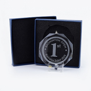 Медаль из стекла, толщиной 8мм. с нанесением лазерной гравировки. Лазерная гравировка производится на высокоточном оборудовании, что позволяет выполнить нанесение с практически любой степенью детализации. Гравировка не имеет видимого углубления внутрь награды, она выглядит и ощущается как матированное стекло. Диаметр медали равен 80мм.