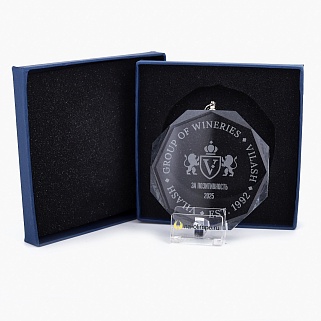 Медаль из стекла, толщиной 8мм. с нанесением лазерной гравировки. Лазерная гравировка производится на высокоточном оборудовании, что позволяет выполнить нанесение с практически любой степенью детализации. Гравировка не имеет видимого углубления внутрь награды, она выглядит и ощущается как матированное стекло. Диаметр медали равен 80мм.