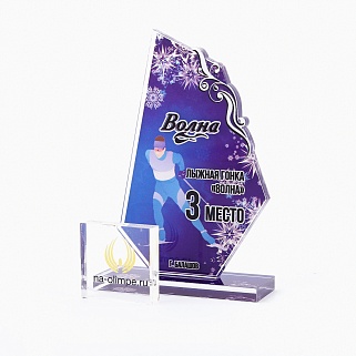 Приз из прозрачного акрила с глянцевой цветной печатью на лицевой стороне и полупрозрачной печатью на задней стенке награды и постаменте.