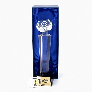 Стеклянная награда на постаменте из черного стекла. Может доукомплектовываться металлической или заливной табличкой с текстом и рисунком. Поставляется в комплекте с подарочным футляром. Табличка в комплект не входит. Вес награды без футляра 930гр.
