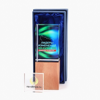 Стеклянная награда с цветным нанесением на деревянном постаменте. Поставляется в комплекте с подарочным футляром. Вес награды без футляра 600гр. Стоимость указана за нанесение на лицевой и оборотной стороне награды. Возможность нанесения на боковые стороны и стоимость этих работ можно уточнить у менеджеров.