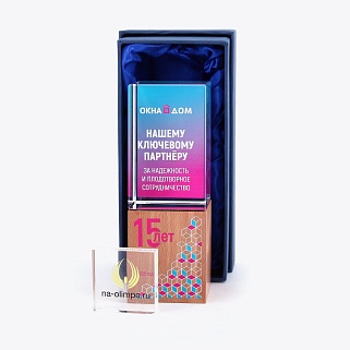 Стеклянная награда с цветным нанесением на деревянном постаменте. Поставляется в комплекте с подарочным футляром. Вес награды без футляра 600гр. Стоимость указана за нанесение на лицевой и оборотной стороне награды. Возможность нанесения на боковые стороны и стоимость этих работ можно уточнить у менеджеров.