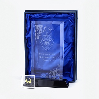 Стеклянная награда с гравировкой. Толщина стекла 15 мм. Поставляется в комплекте с подарочным футляром. Вес награды без футляра 940гр. Стоимость указана за нанесение на одной стороне, гравировка выполняется на задней стенке награды.