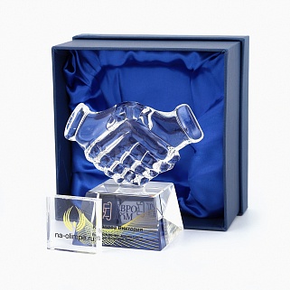 Стеклянная награда рукопожатие с цветной печатью на постаменте. Поставляется в комплекте с подарочным футляром. Вес награды без футляра 525гр.